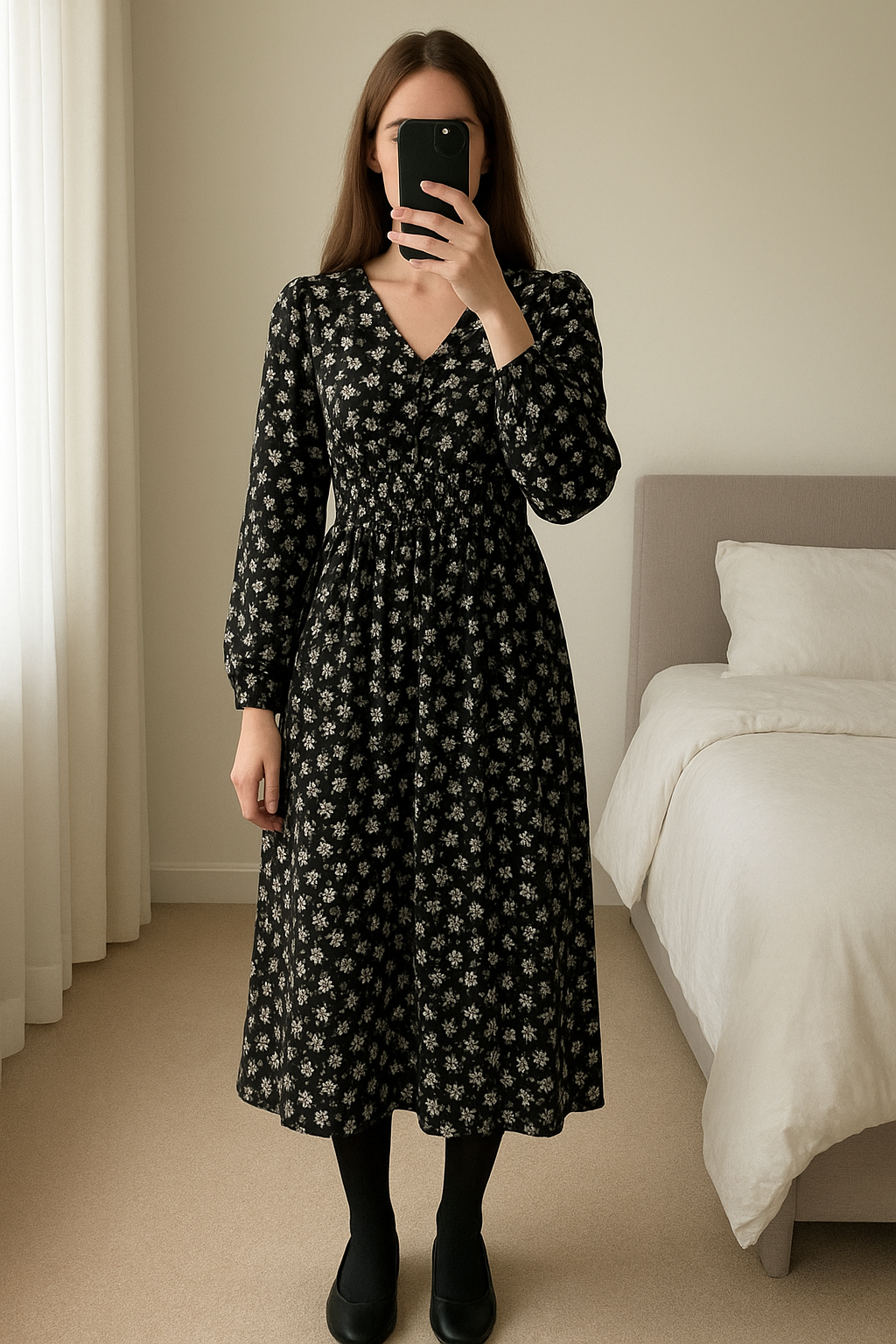 Robe longue debout, face à la caméra, dans une chambre à la lumière douce, avec une lumière naturelle filtrant par la fenêtre.