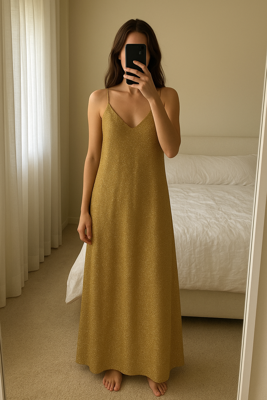 Robe longue dos nu oséree debout, face à la caméra, dans une chambre à la lumière douce, avec une lumière naturelle filtrant par la fenêtre.
