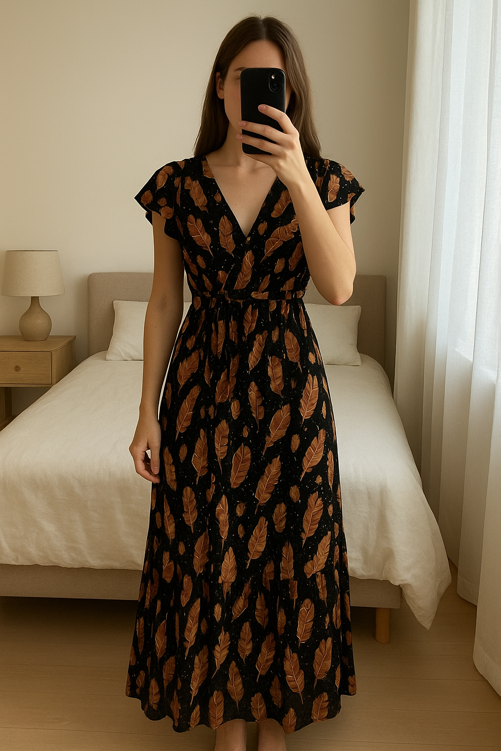Robe longue fluide à motifs plumes – Taille L debout, face à la caméra, dans une chambre à la lumière douce, avec une lumière naturelle filtrant par la fenêtre.