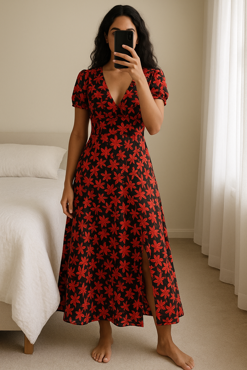 robe longue manches courtes debout, face à la caméra, dans une chambre à la lumière douce, avec une lumière naturelle filtrant par la fenêtre.