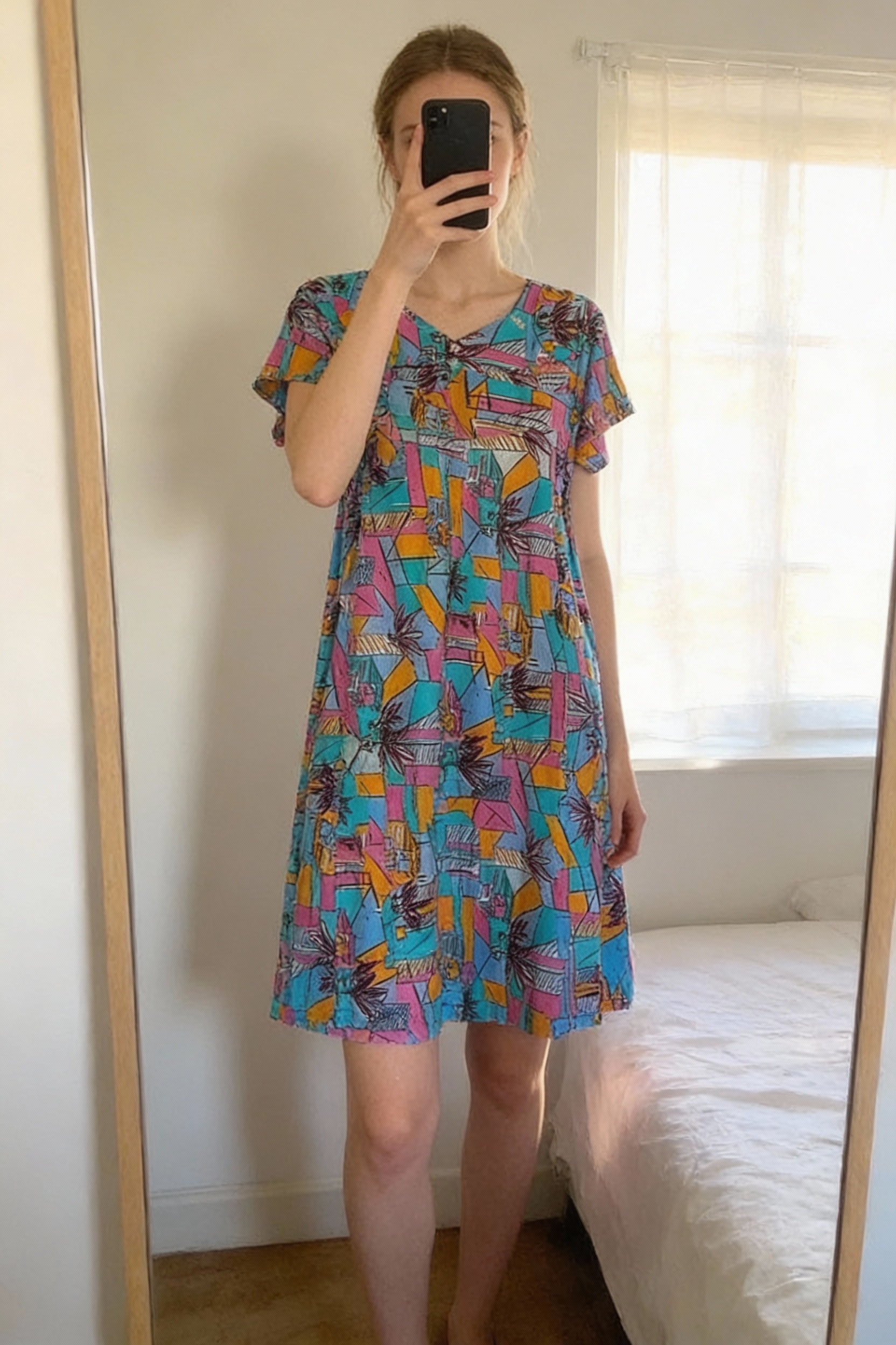 Une personne en Robe longue à motifs debout, face à la caméra, avec une silhouette fine, dans une chambre à la lumière douce, avec une lumière naturelle filtrant par la fenêtre.