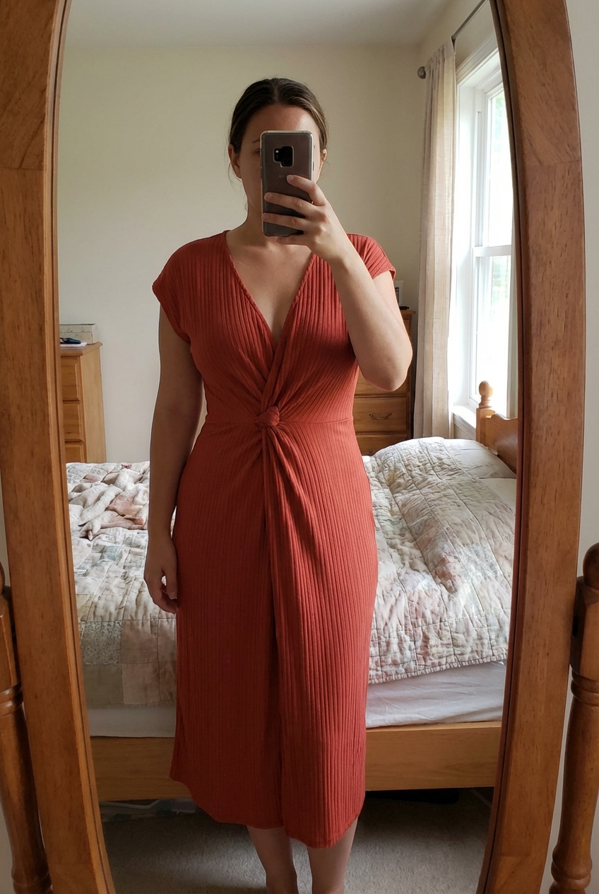 Une personne en 🧡 Robe longue Penti plissée orange cambrant légèrement le dos pour une pose dynamique, avec une silhouette légèrement plus ronde, dans une chambre à la lumière douce, avec une lumière naturelle filtrant par la fenêtre.
