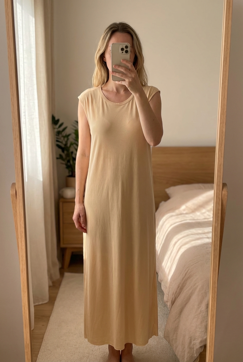 Une personne en Robe longue sans manches beige - femme - Americain Vintage debout, face à la caméra, dans une chambre à la lumière douce, avec une lumière naturelle filtrant par la fenêtre.