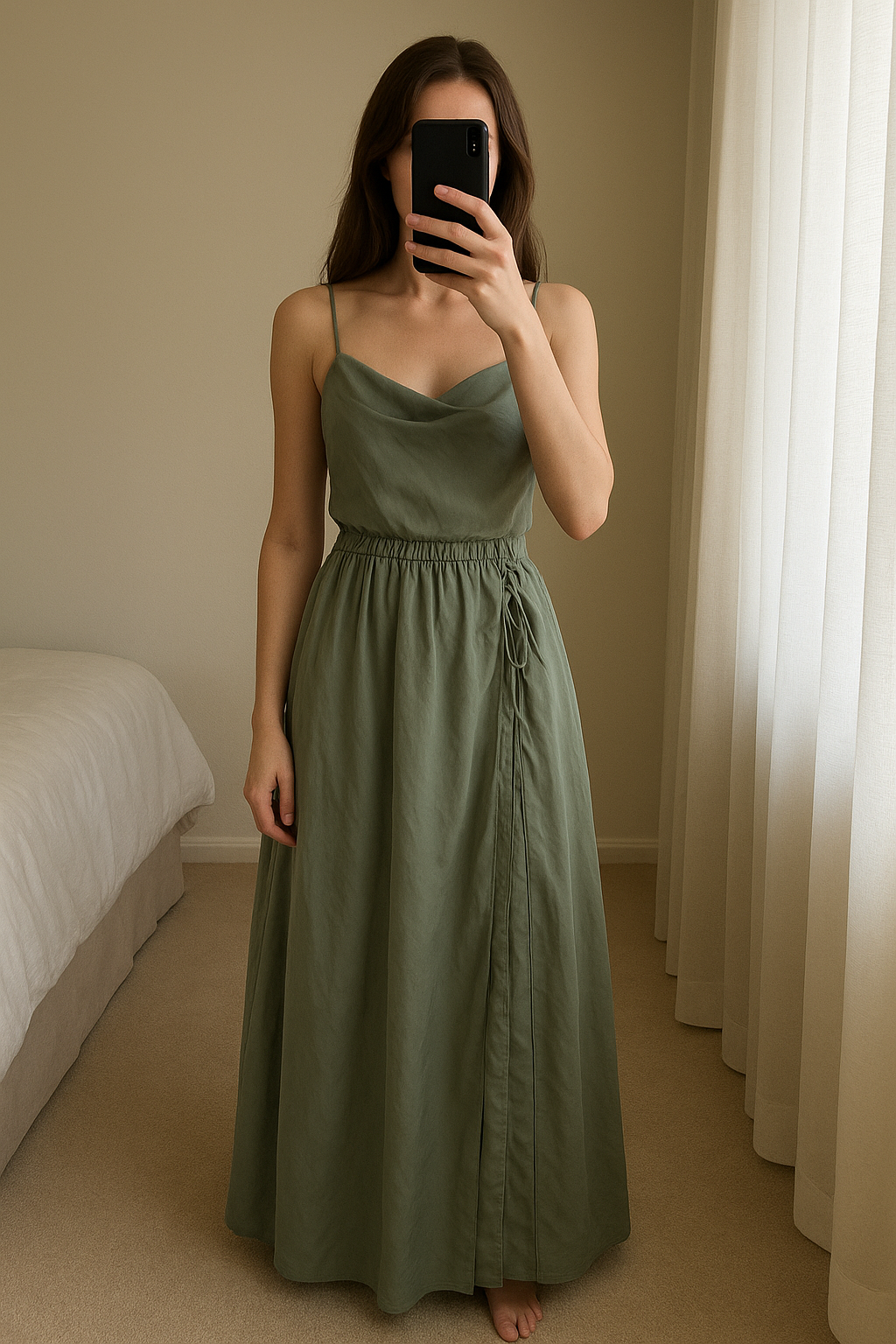 Robe longue satinée vert sauge – Taille M debout, face à la caméra, dans une chambre à la lumière douce, avec une lumière naturelle filtrant par la fenêtre.