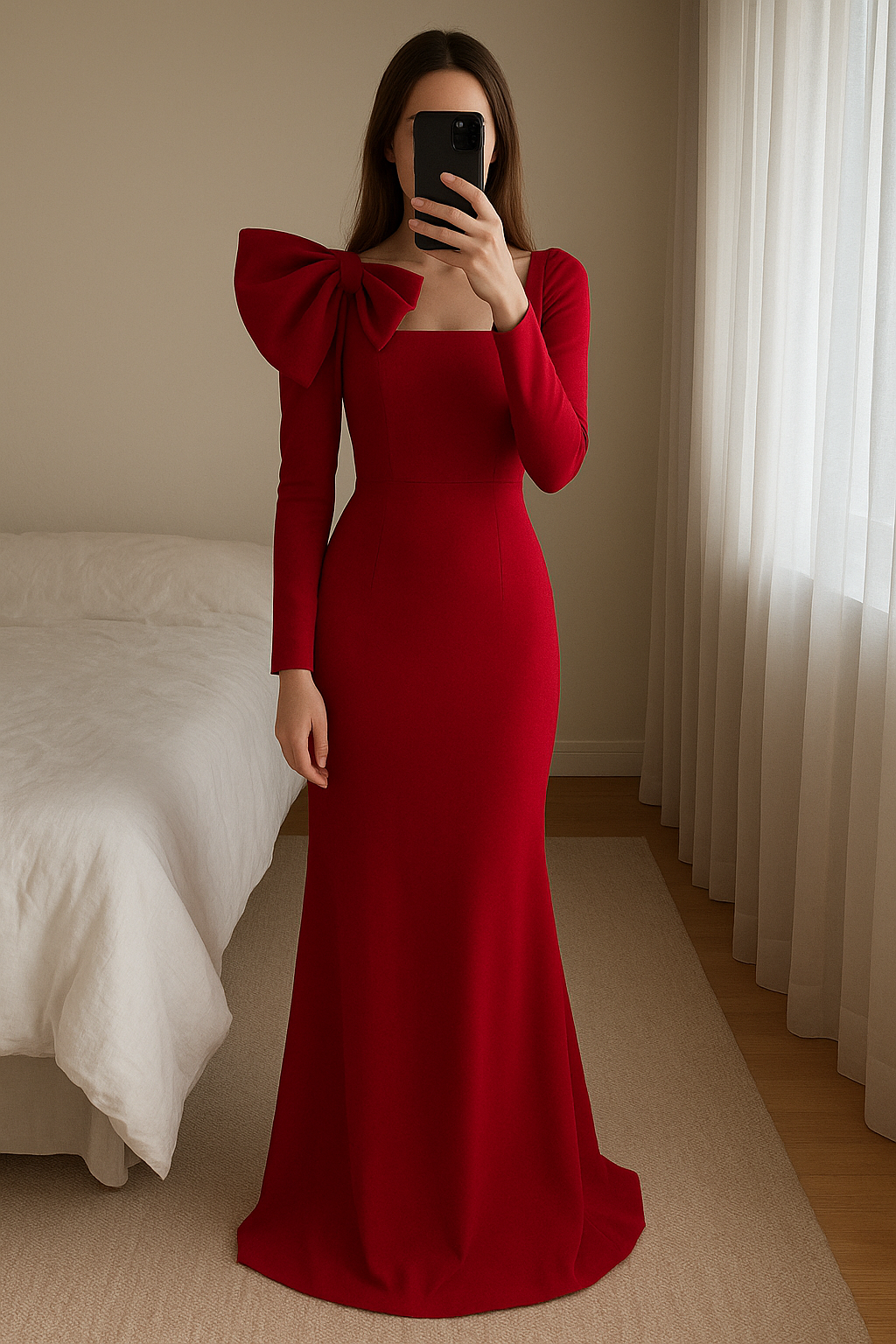 Robe longue à traîne et noeud debout, face à la caméra, dans une chambre à la lumière douce, avec une lumière naturelle filtrant par la fenêtre.
