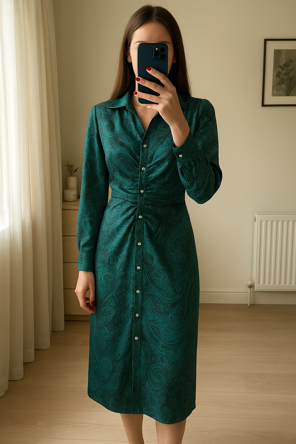 Robe longue Zara debout, face à la caméra, dans une chambre à la lumière douce, avec une lumière naturelle filtrant par la fenêtre.