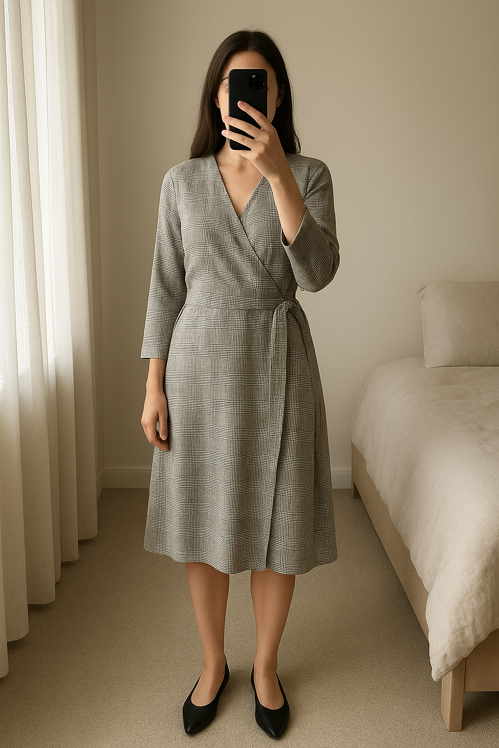 Robe Mango taille 34 debout, face à la caméra, dans une chambre à la lumière douce, avec une lumière naturelle filtrant par la fenêtre.