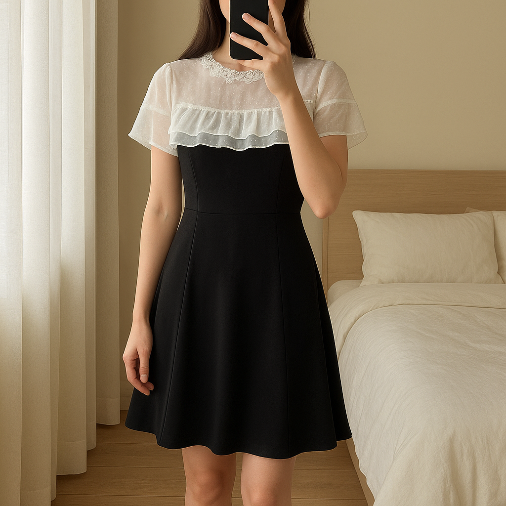 Robe noir, col dentelle debout, face à la caméra, dans une chambre à la lumière douce, avec une lumière naturelle filtrant par la fenêtre.