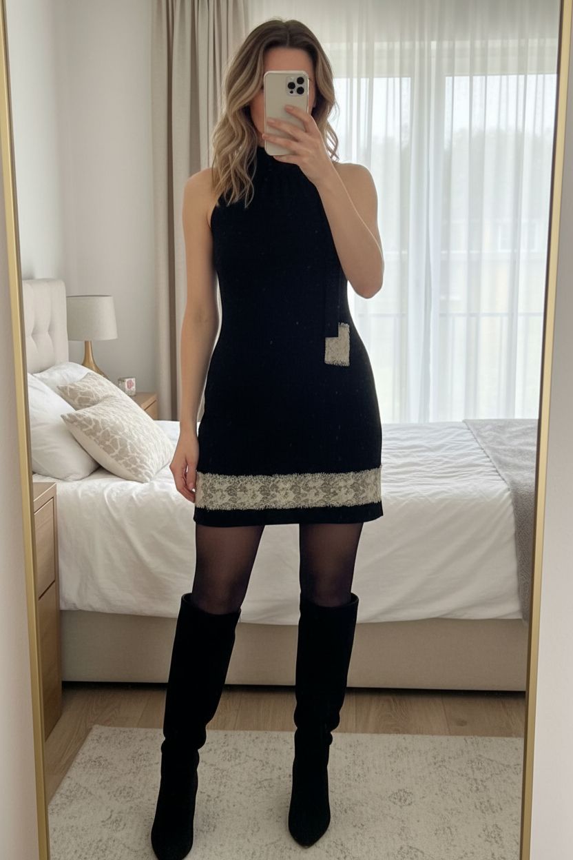 Robe noir et blanc debout, face à la caméra, dans une chambre à la lumière douce, avec une lumière naturelle filtrant par la fenêtre.