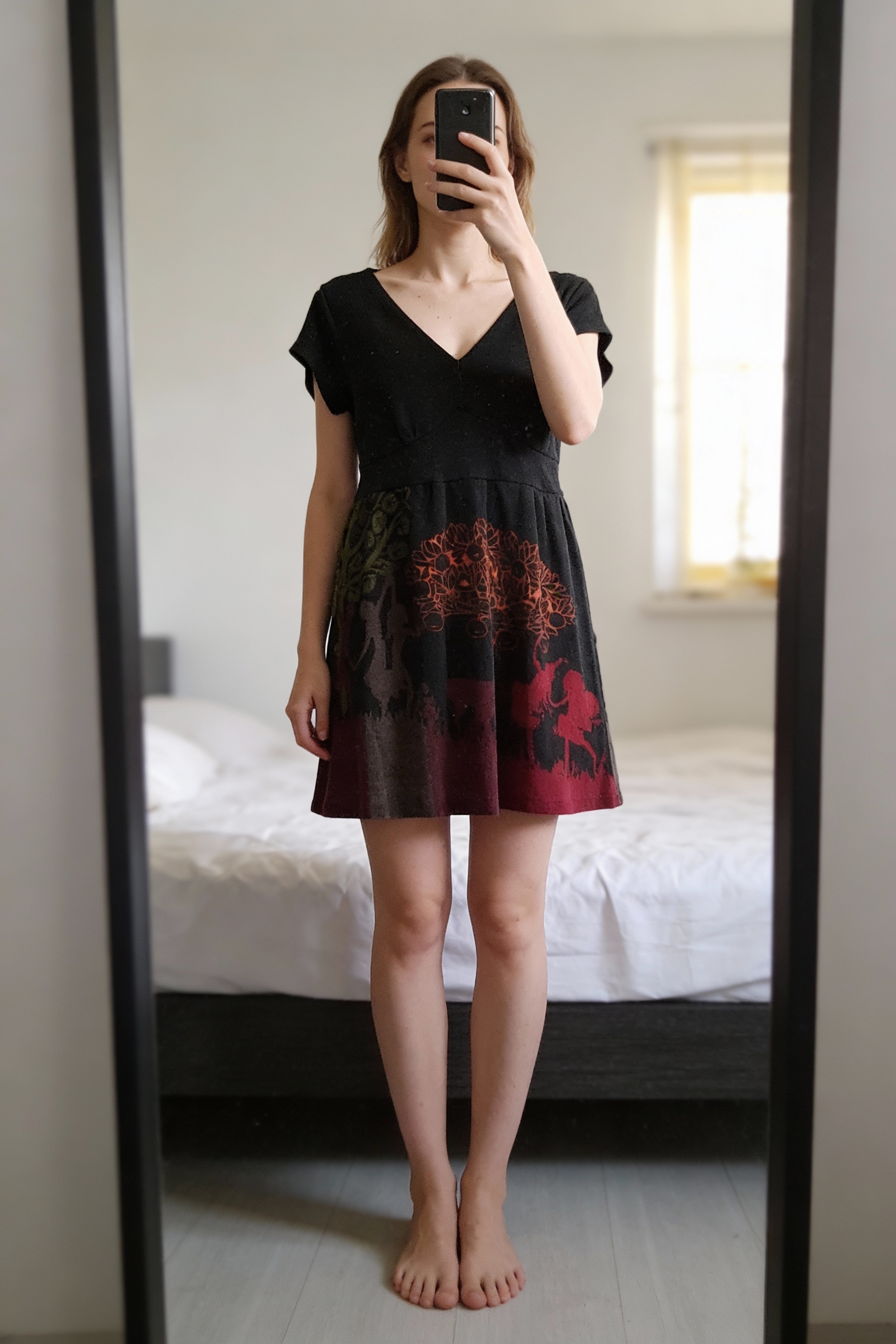 robe noir et rouge debout, face à la caméra, dans une chambre à la lumière douce, avec une lumière naturelle filtrant par la fenêtre.