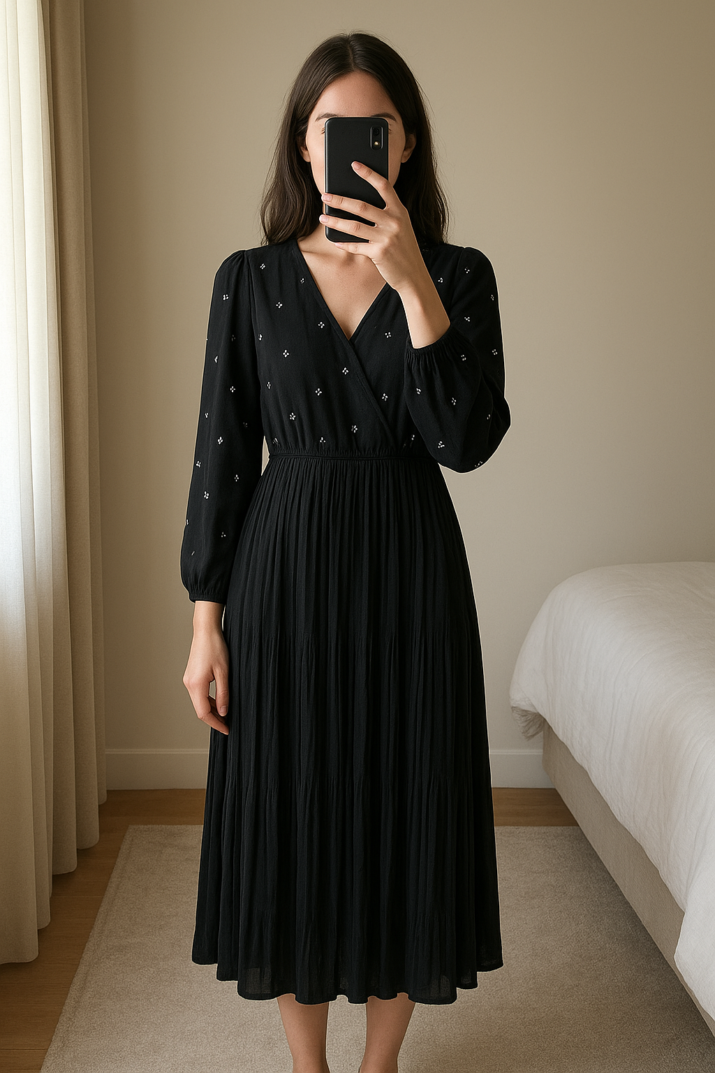 Robe noir manche longue LTC debout, face à la caméra, dans une chambre à la lumière douce, avec une lumière naturelle filtrant par la fenêtre.