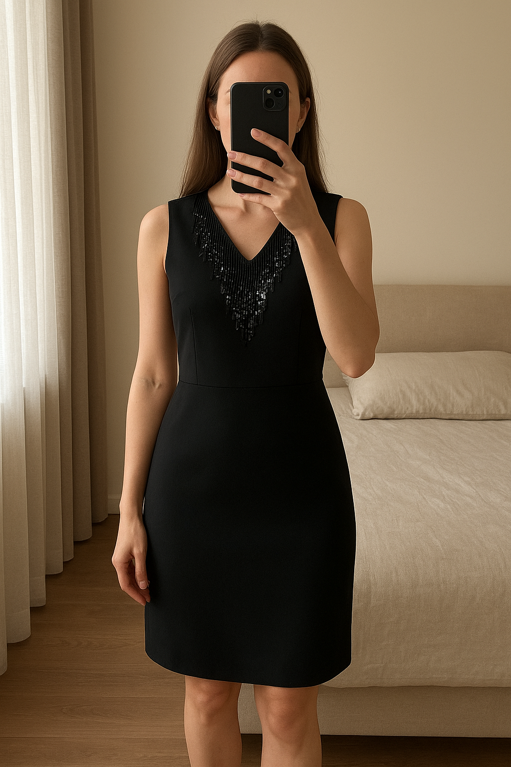 🌹 Robe noire élégante avec sequins – Taille 38-40 debout, face à la caméra, dans une chambre à la lumière douce, avec une lumière naturelle filtrant par la fenêtre.