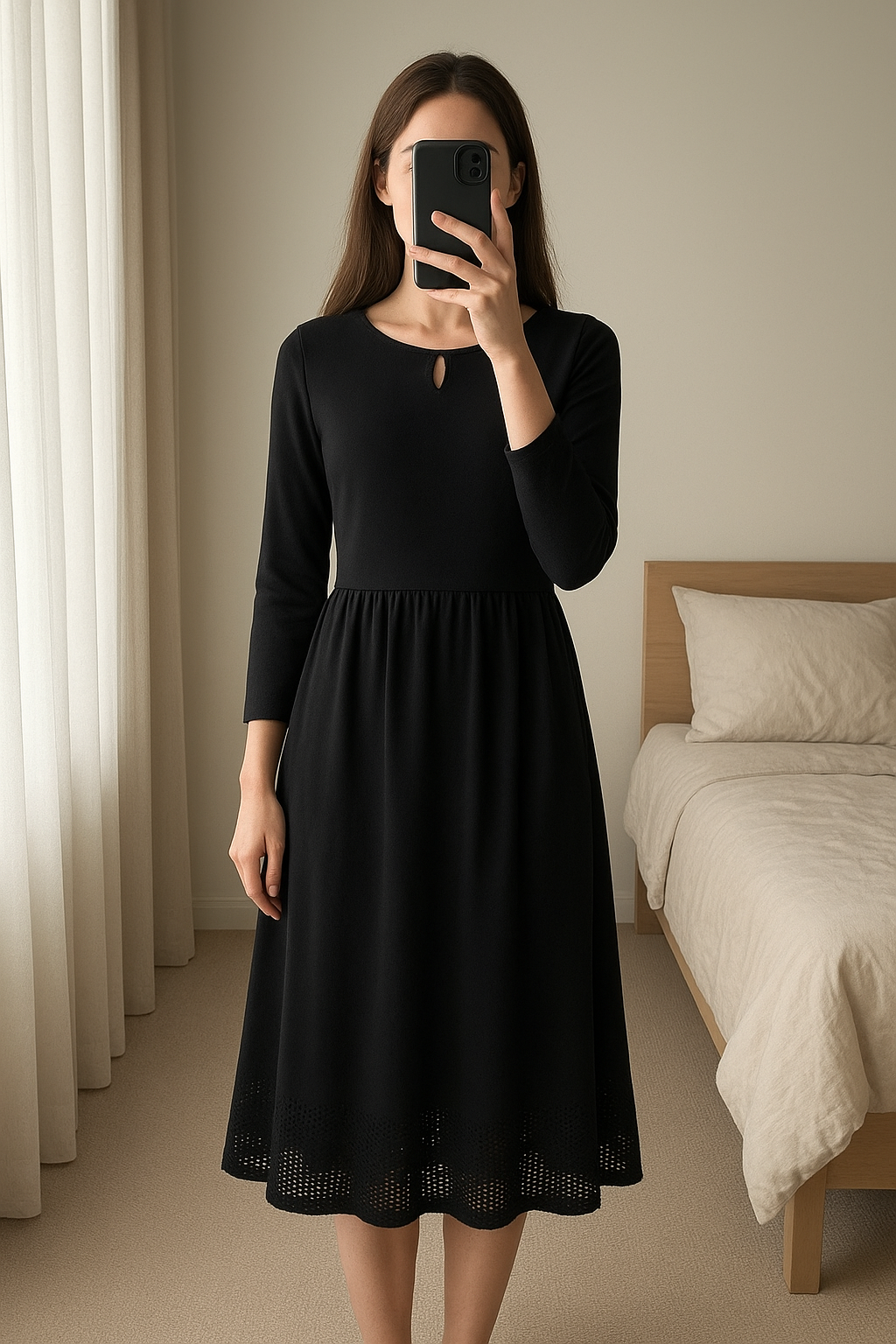 Robe noire Taille S debout, face à la caméra, dans une chambre à la lumière douce, avec une lumière naturelle filtrant par la fenêtre.