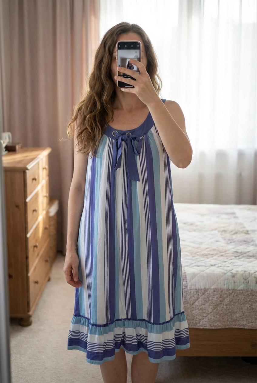 Robe Pepe Jeans debout, face à la caméra, dans une chambre à la lumière douce, avec une lumière naturelle filtrant par la fenêtre.