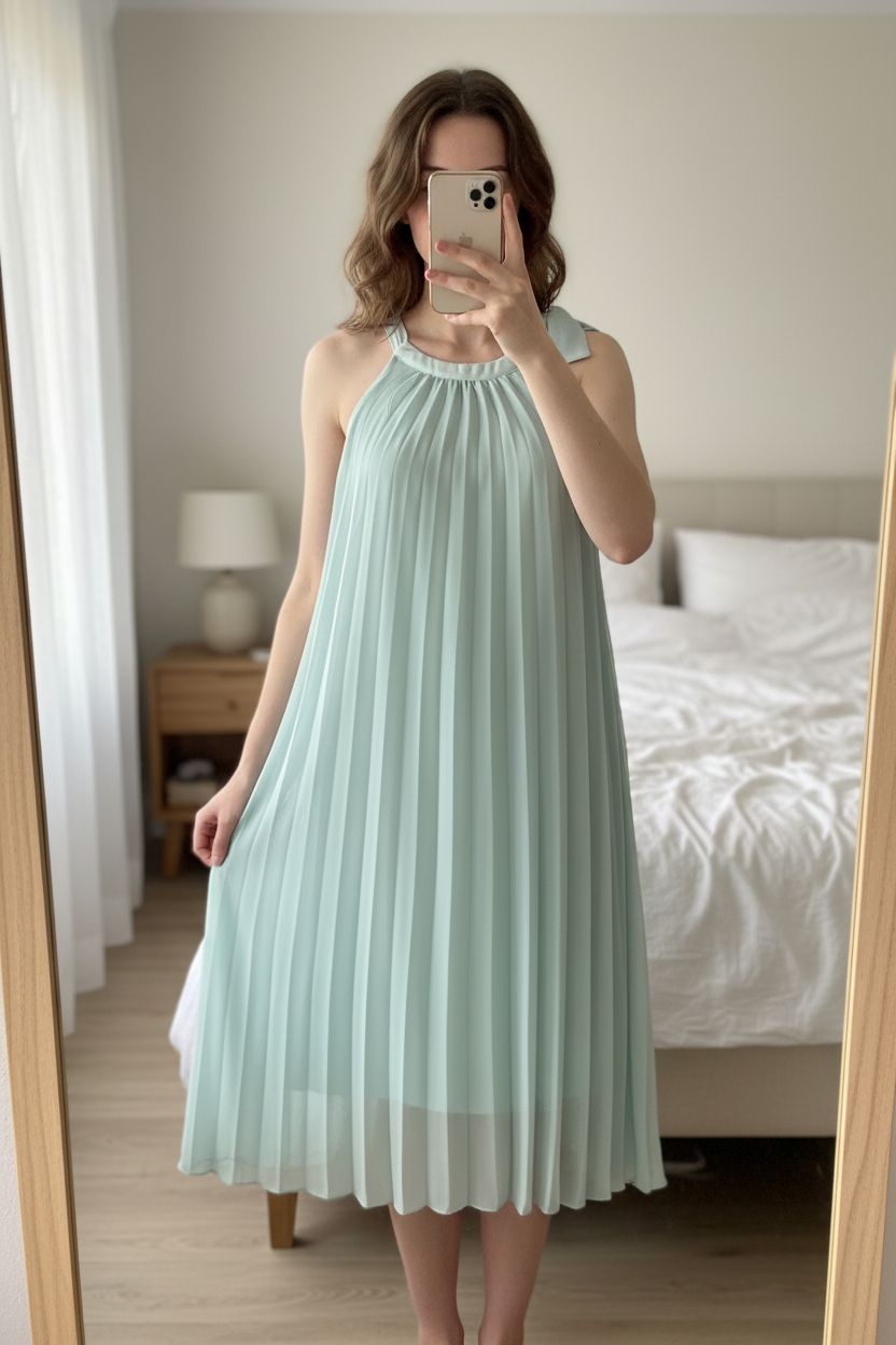 Robe plissée naf naf debout, face à la caméra, dans une chambre à la lumière douce, avec une lumière naturelle filtrant par la fenêtre.