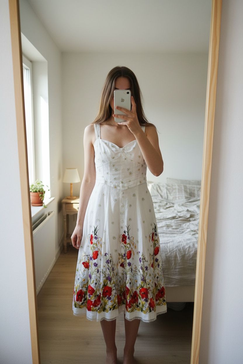 Robe printanière pin up karen Millen vintage 40/42 debout, face à la caméra, dans une chambre à la lumière douce, avec une lumière naturelle filtrant par la fenêtre.