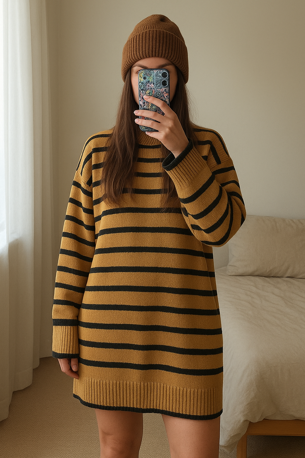 Robe pull debout, face à la caméra, dans une chambre à la lumière douce, avec une lumière naturelle filtrant par la fenêtre.