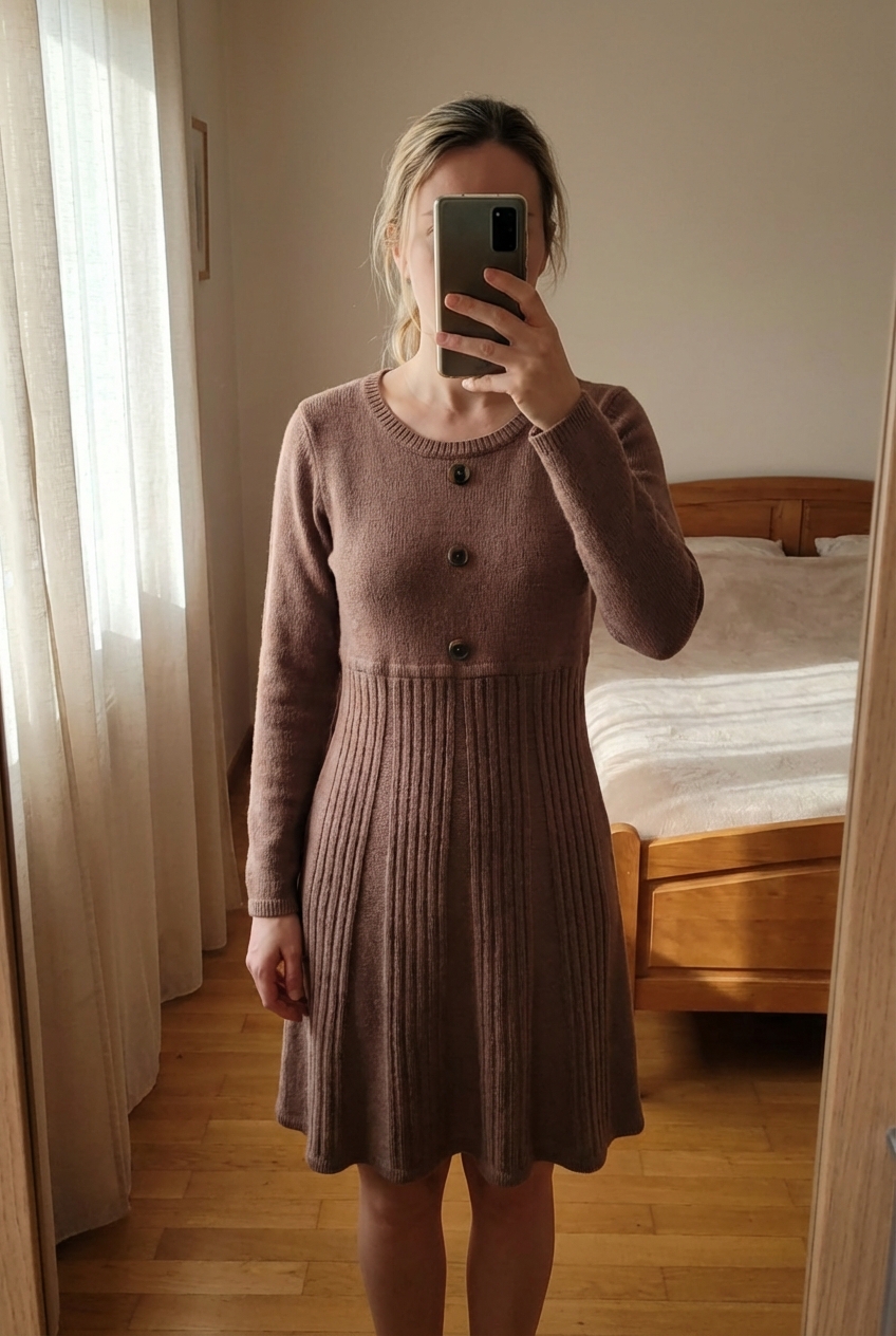 Robe pull marron à boutons – Blancheporte debout, face à la caméra, dans une chambre à la lumière douce, avec une lumière naturelle filtrant par la fenêtre.