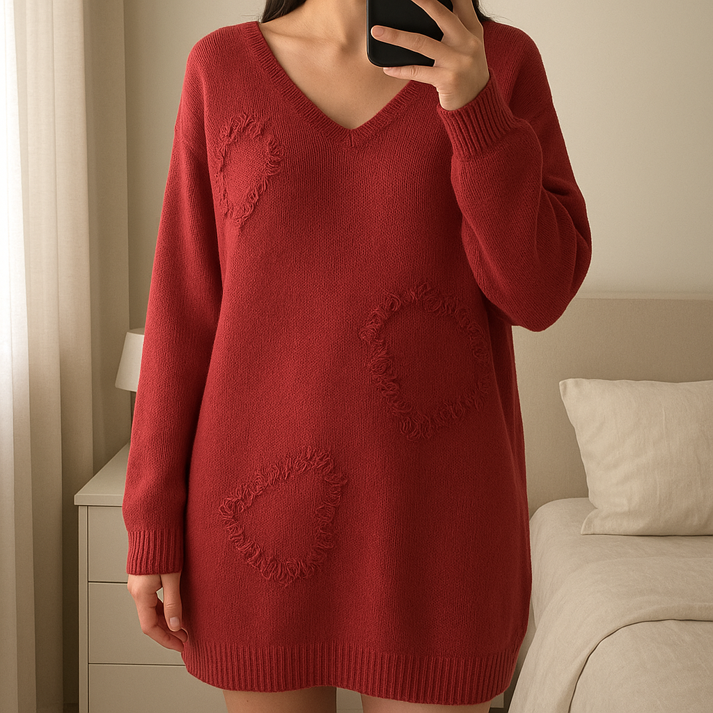Robe pull overside bordeaux debout, face à la caméra, dans une chambre à la lumière douce, avec une lumière naturelle filtrant par la fenêtre.
