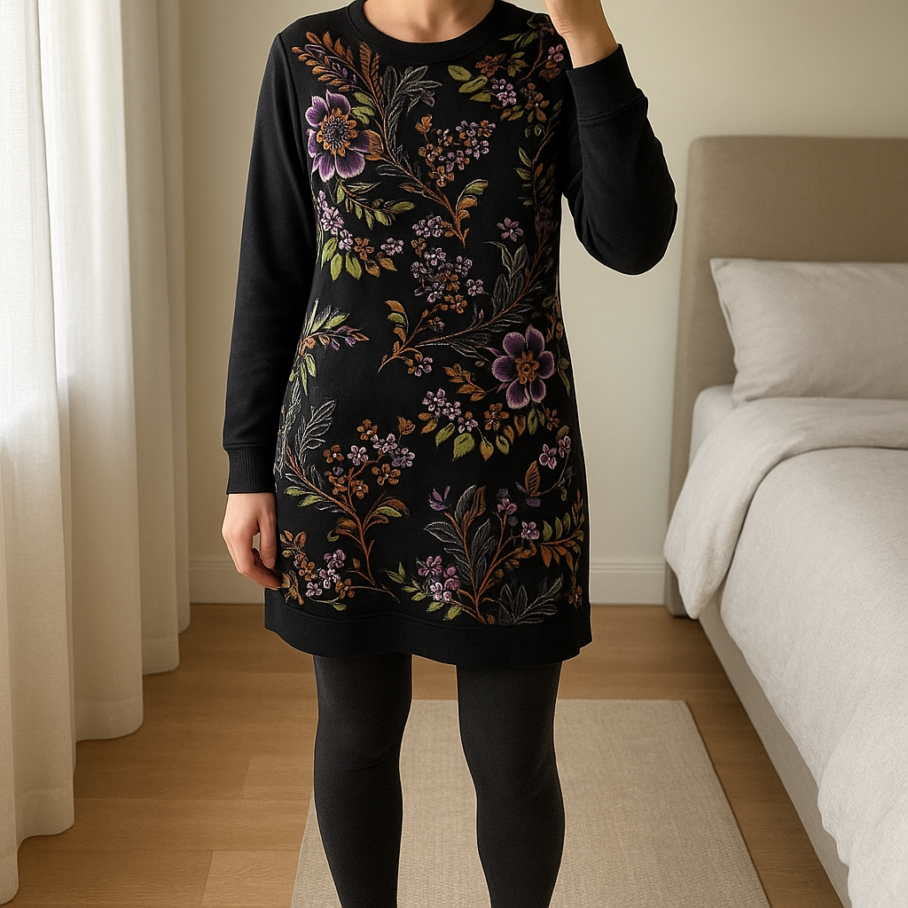 Robe pull rene derhy 36 comme neuve debout, face à la caméra, dans une chambre à la lumière douce, avec une lumière naturelle filtrant par la fenêtre.