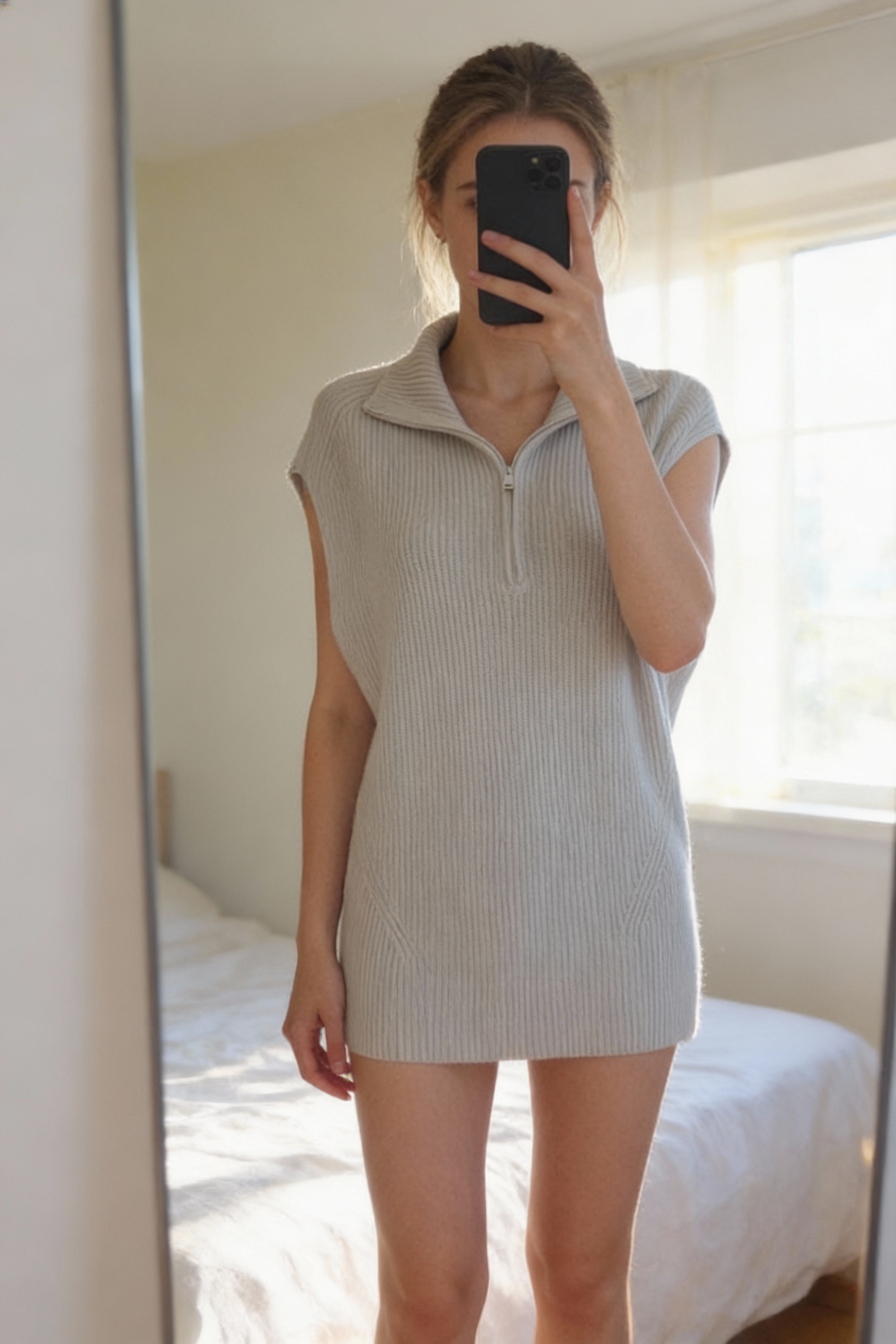 Une personne en Robe pull sans manche - femme - XS - H&M - Neuf debout, face à la caméra, dans une chambre à la lumière douce, avec une lumière naturelle filtrant par la fenêtre.
