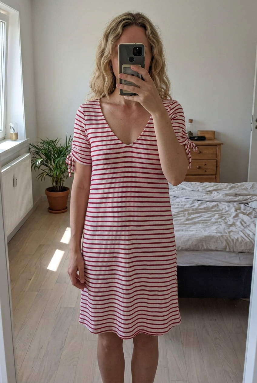 Robe rayée rouge et blanche Mango XS debout, face à la caméra, dans une chambre à la lumière douce, avec une lumière naturelle filtrant par la fenêtre.