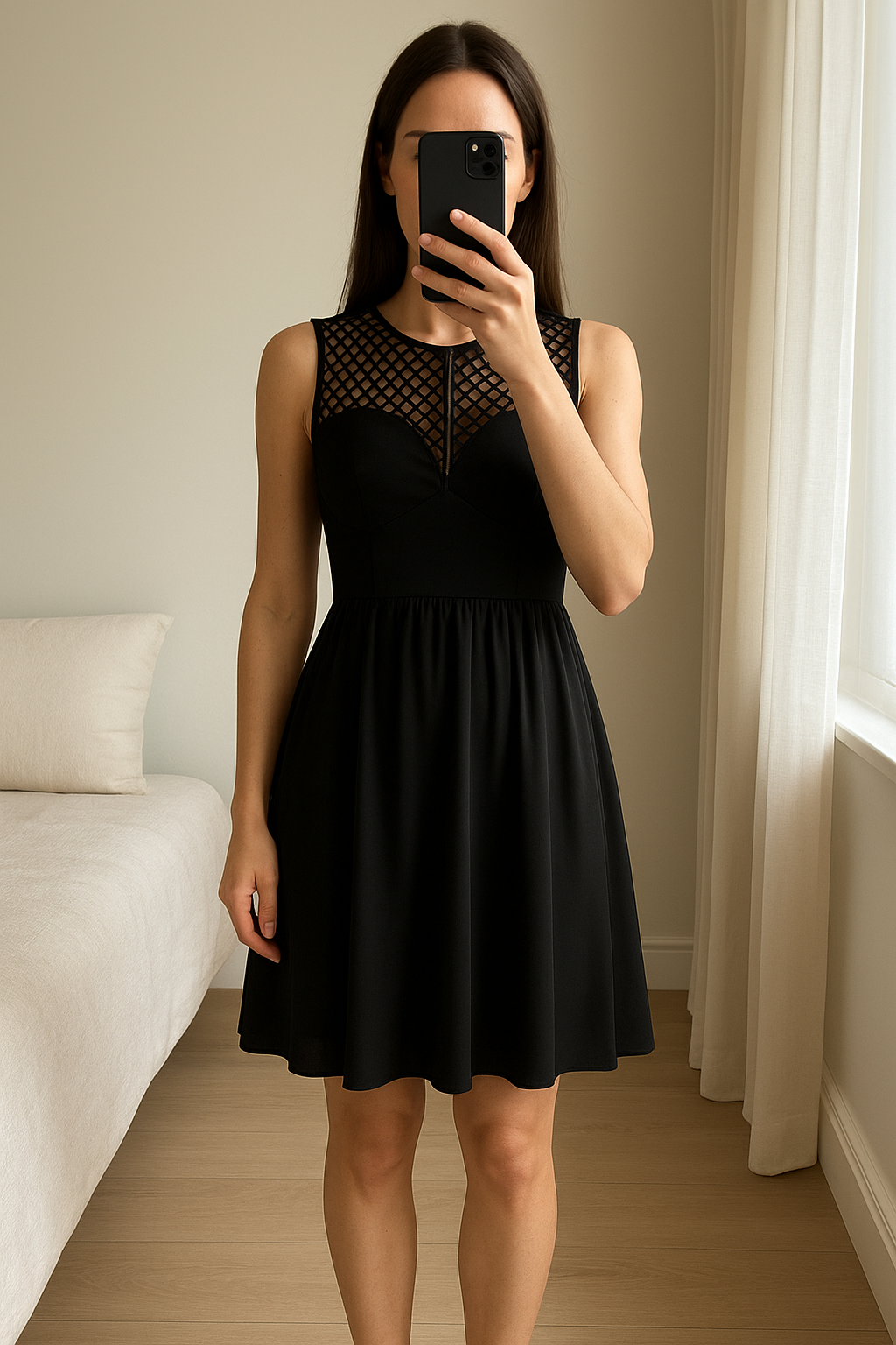 Robe Sandro pour cérémonie ou fêtes t 1 debout, face à la caméra, dans une chambre à la lumière douce, avec une lumière naturelle filtrant par la fenêtre.