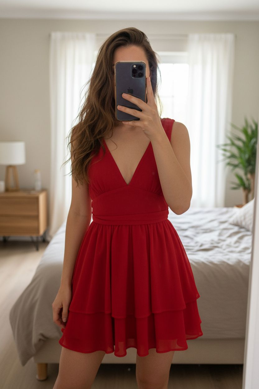 Robe Shein rouge décolleté agrandit V volants debout, face à la caméra, dans une chambre à la lumière douce, avec une lumière naturelle filtrant par la fenêtre.