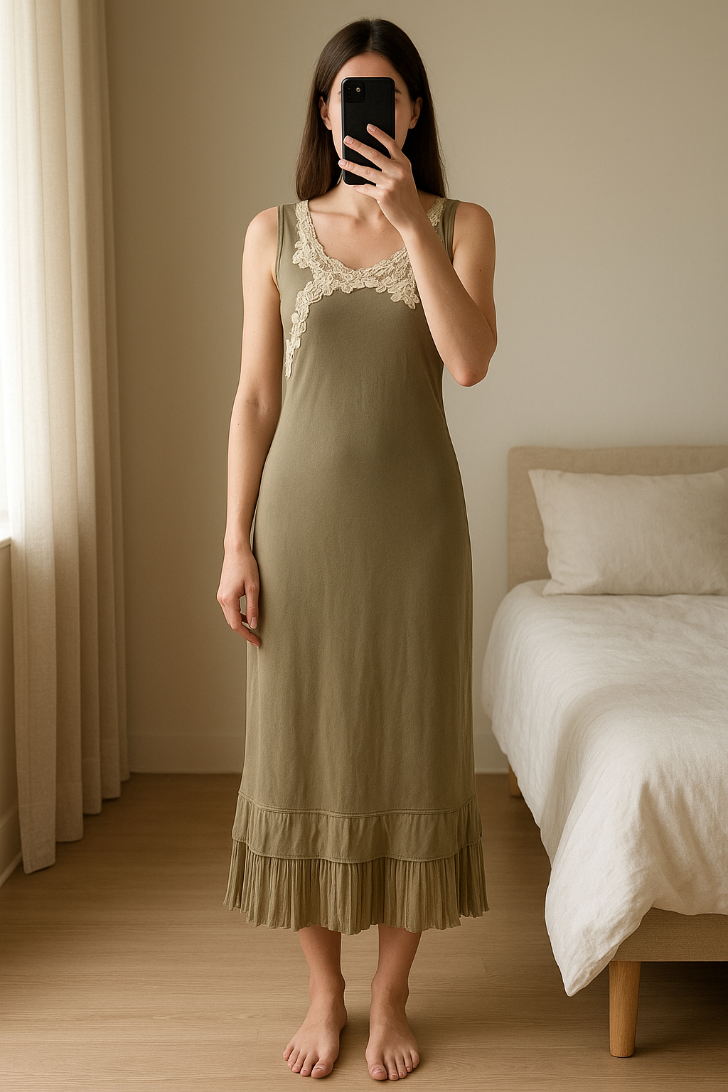 Robe taille 38 debout, face à la caméra, dans une chambre à la lumière douce, avec une lumière naturelle filtrant par la fenêtre.