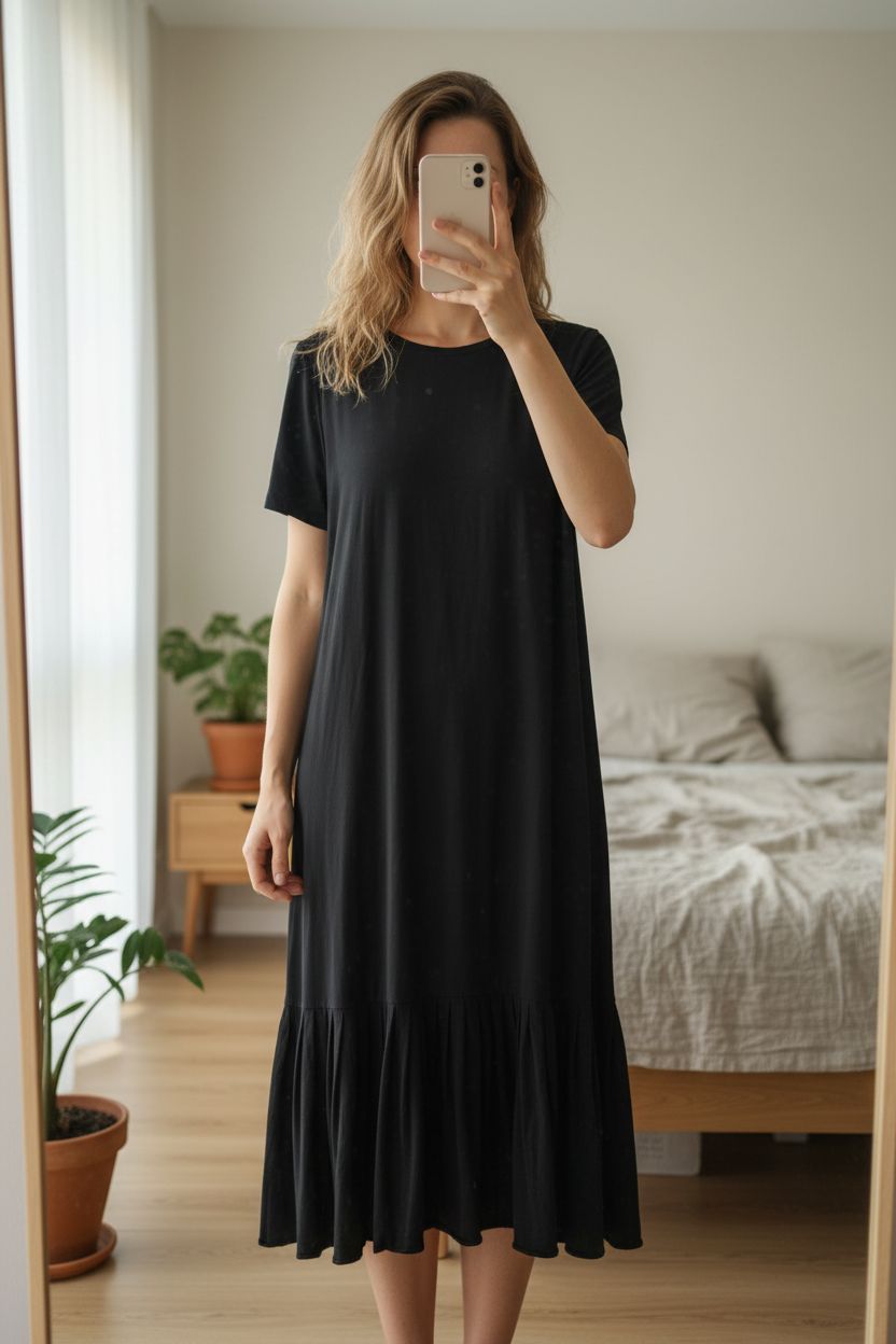 Robe tee-shirt noire taille S debout, face à la caméra, dans une chambre à la lumière douce, avec une lumière naturelle filtrant par la fenêtre.