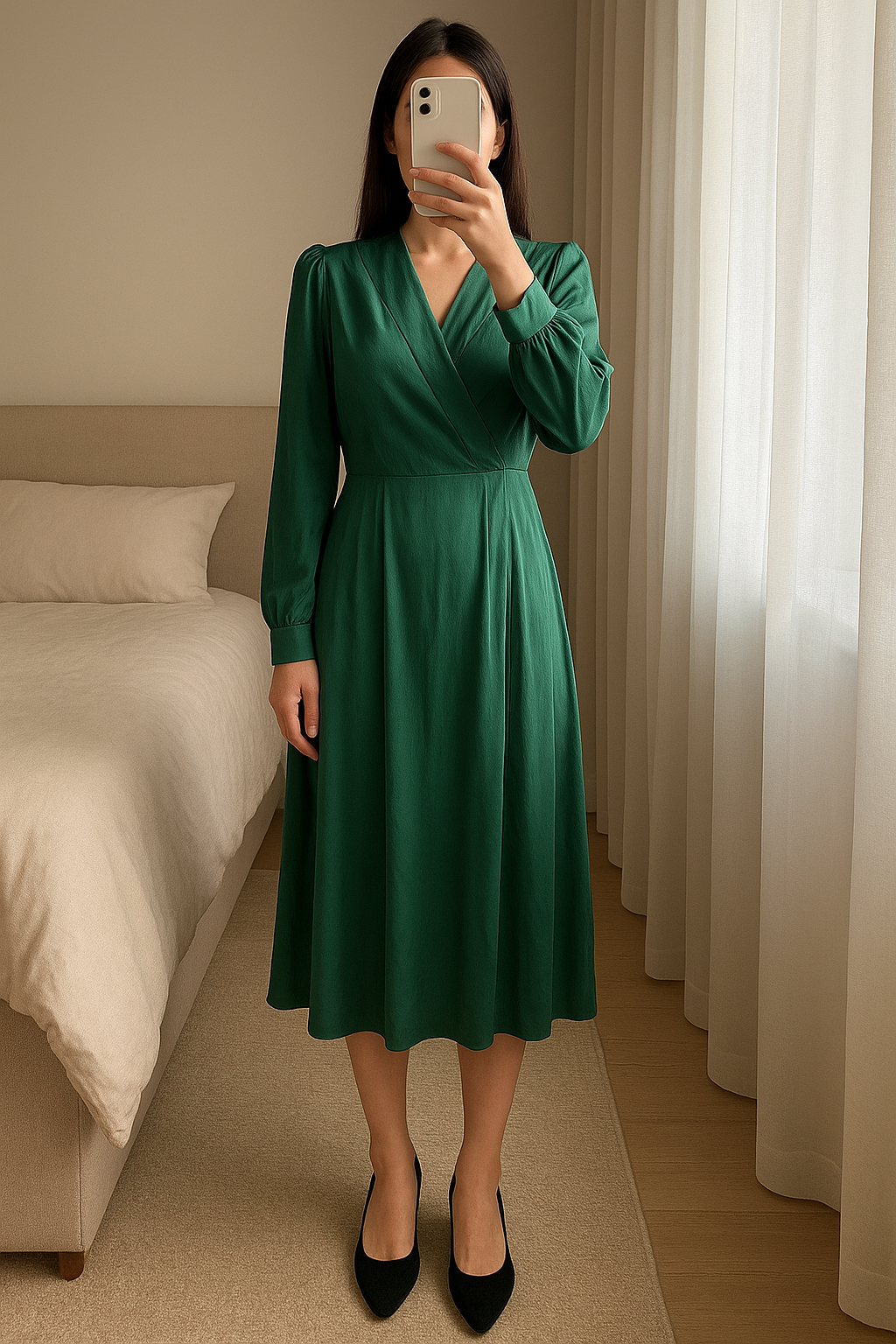Robe vert satin debout, face à la caméra, dans une chambre à la lumière douce, avec une lumière naturelle filtrant par la fenêtre.
