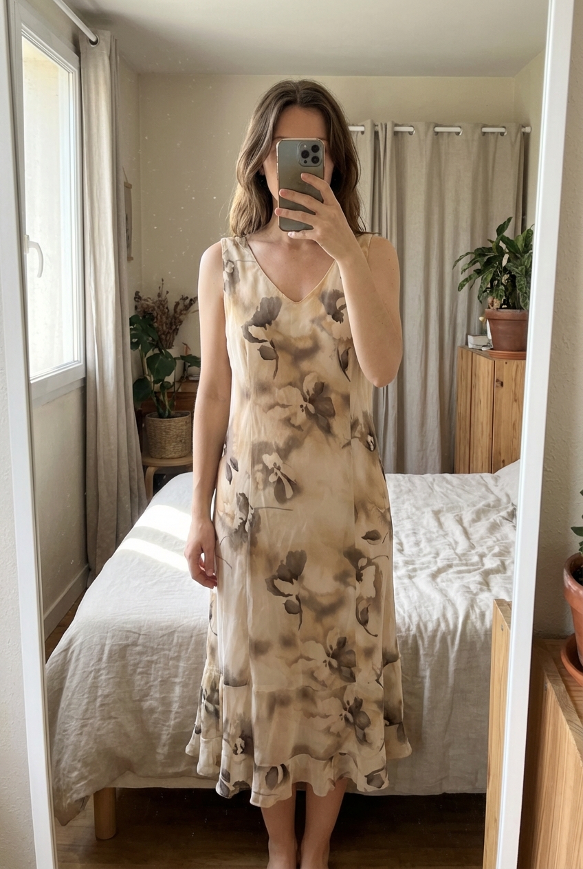 Robe Zara taille 44 debout, face à la caméra, dans une chambre à la lumière douce, avec une lumière naturelle filtrant par la fenêtre.