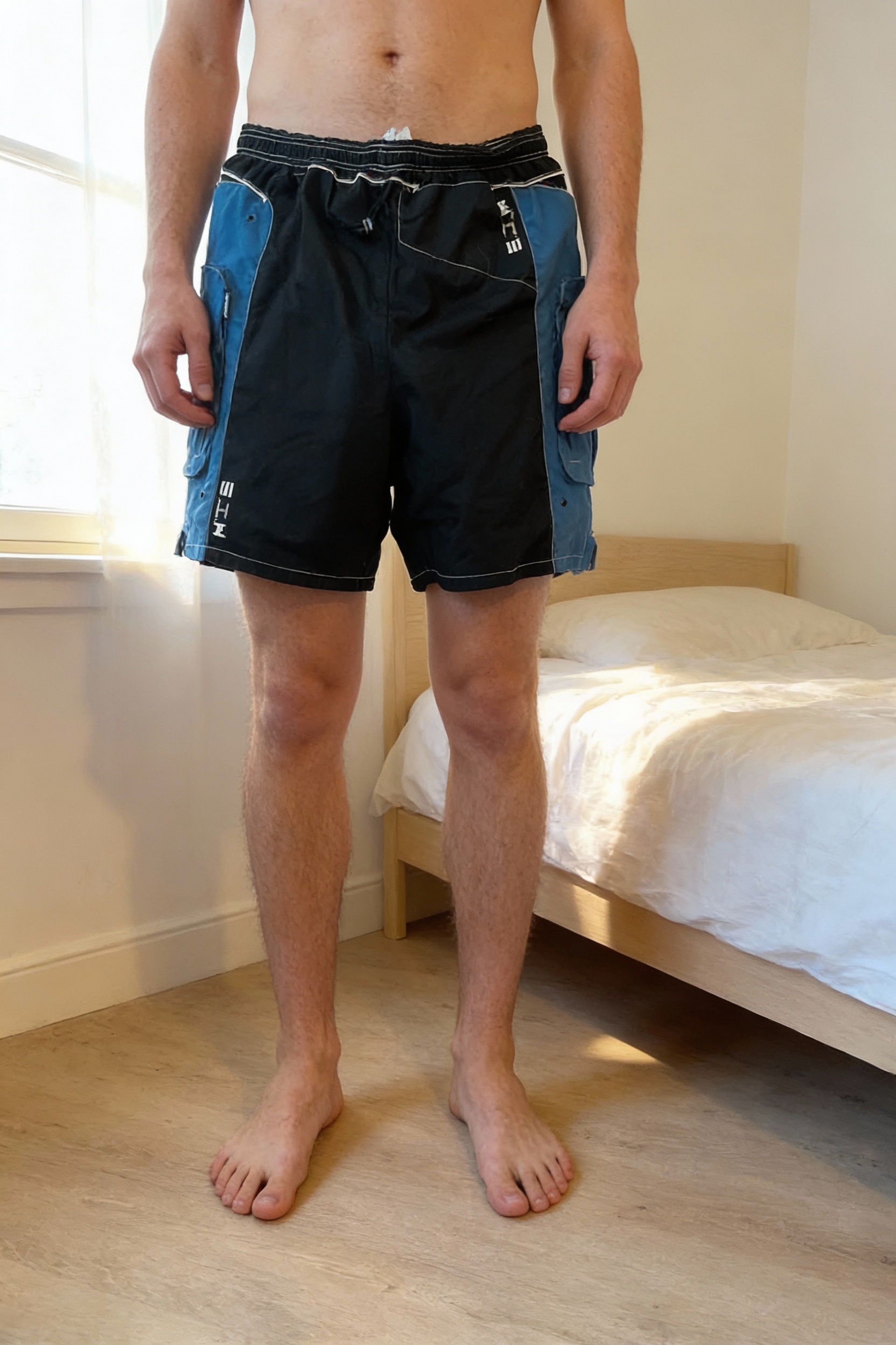 Rockrider decathlon cycling shorts with padding standing straight facing the camera, in a softly lit bedroom setting, with gentle natural light filtering through a window.