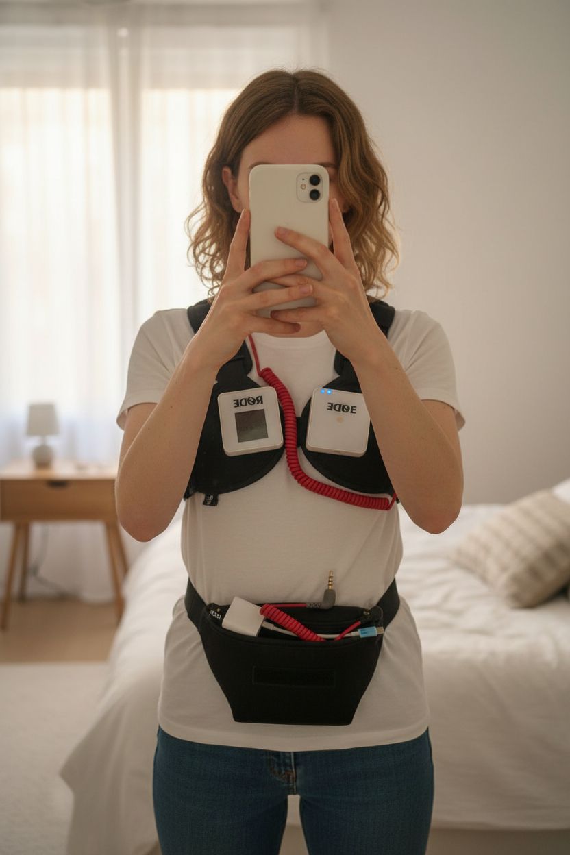 Rode Wireless Go Microphone standing straight facing the camera, in a softly lit bedroom setting, with gentle natural light filtering through a window.