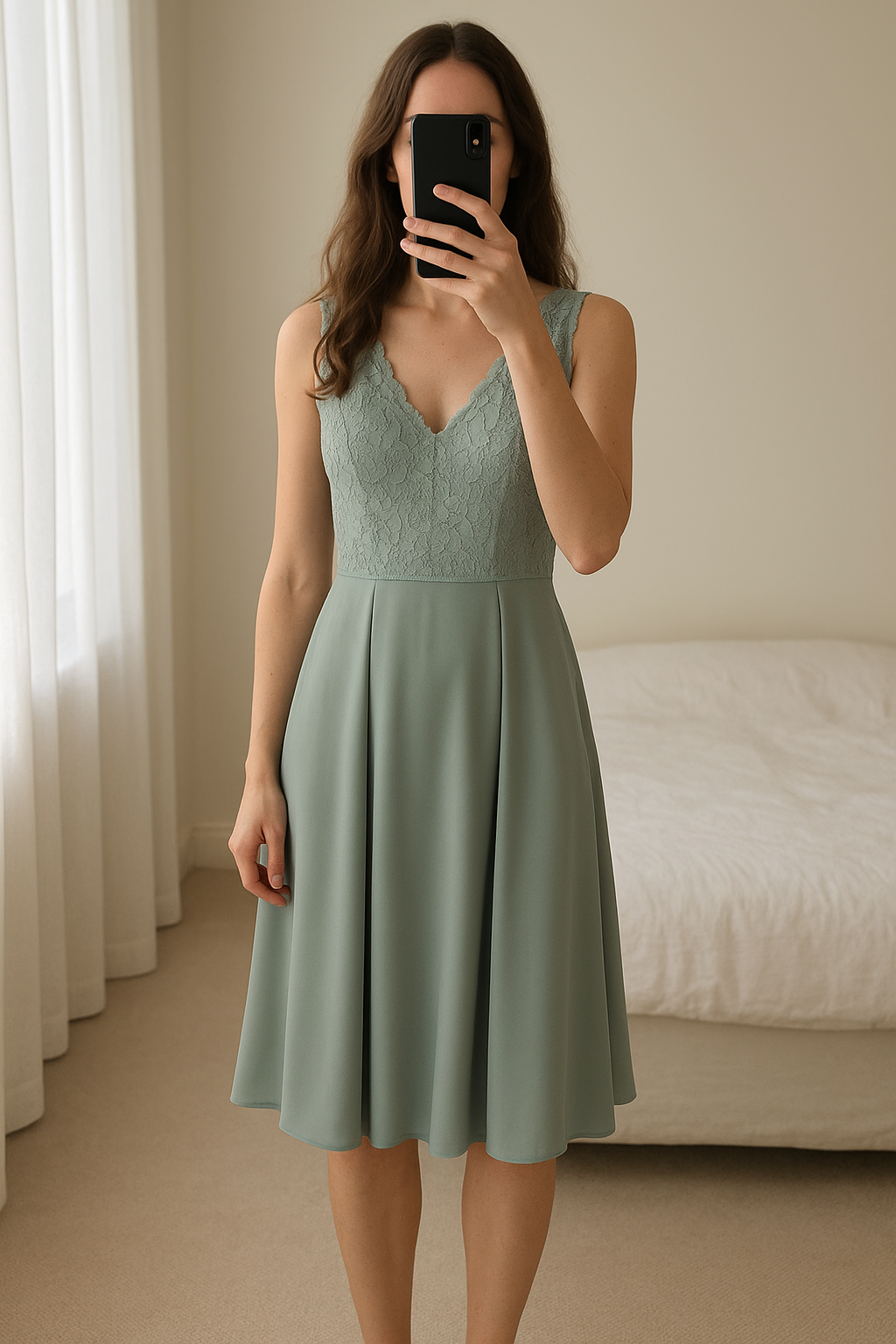 Roman Pale mint green Lace Fit & Flare dress standing straight facing the camera, in a softly lit bedroom setting, with gentle natural light filtering through a window.
