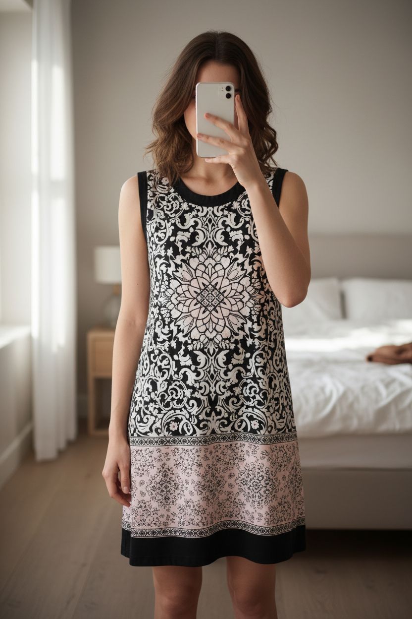 s.Oliver Black White Print Shift Dress size M Y2K Stretch Sleeveless vintage tunic standing straight facing the camera, in a softly lit bedroom setting, with gentle natural light filtering through a window.