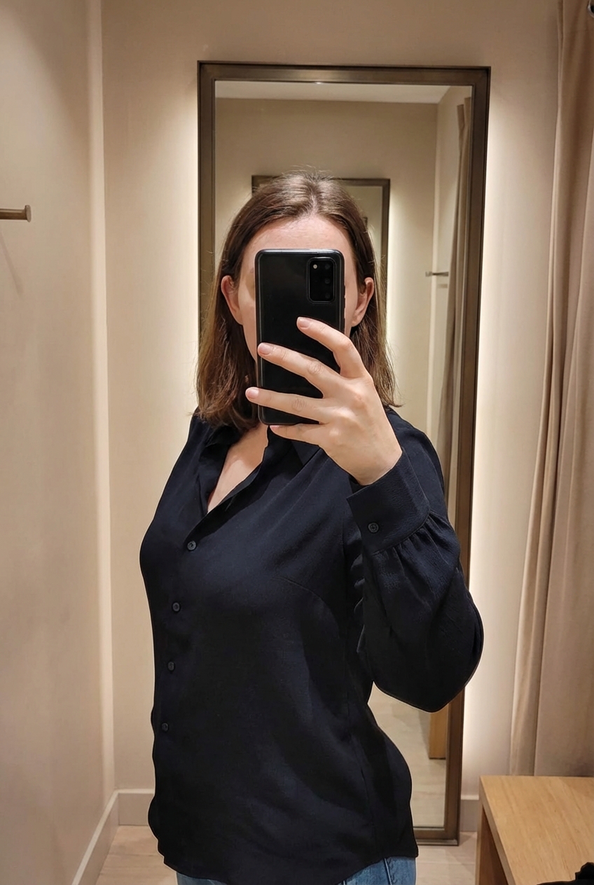 A person in Sötétkék női ing, tökéletes állapot, csinos kényelmes viselet, Next 14/L arching their back slightly for a dynamic pose, with a slightly curvier body type, in a boutique-style fitting room with a mirror and neutral decor.