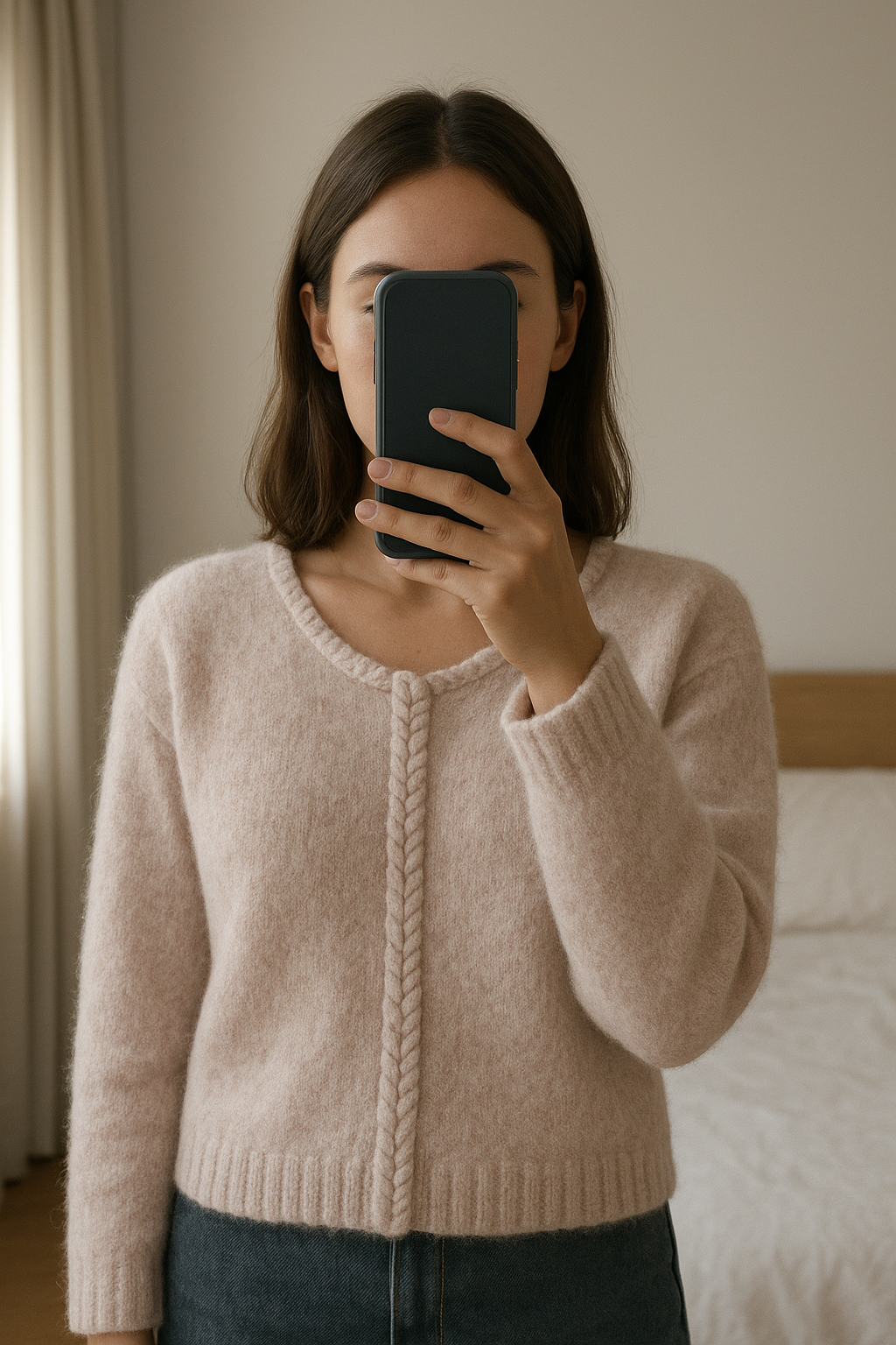 Sézane alpaca/angora wollen trui kindermaat M debout, face à la caméra, dans une chambre à la lumière douce, avec une lumière naturelle filtrant par la fenêtre.