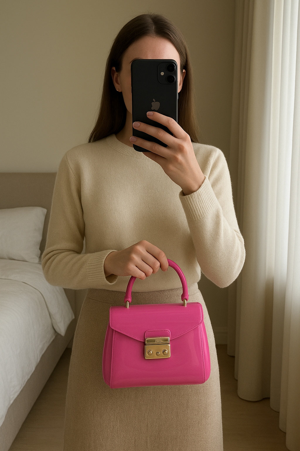 Sac Furla debout, face à la caméra, dans une chambre à la lumière douce, avec une lumière naturelle filtrant par la fenêtre.