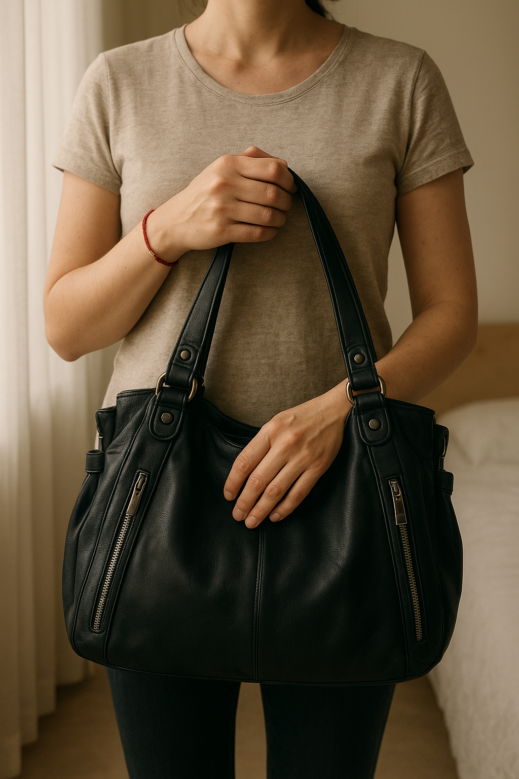 Sac à main Tote Vintage Chic pour Femme 💖 debout, face à la caméra, dans une chambre à la lumière douce, avec une lumière naturelle filtrant par la fenêtre.