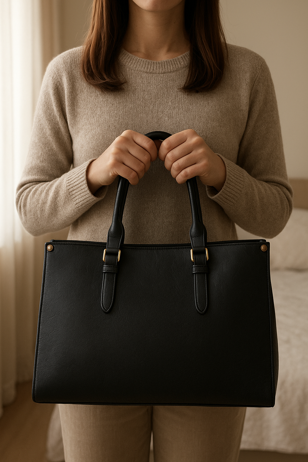 Sac noir grand format en très bon état debout, face à la caméra, dans une chambre à la lumière douce, avec une lumière naturelle filtrant par la fenêtre.