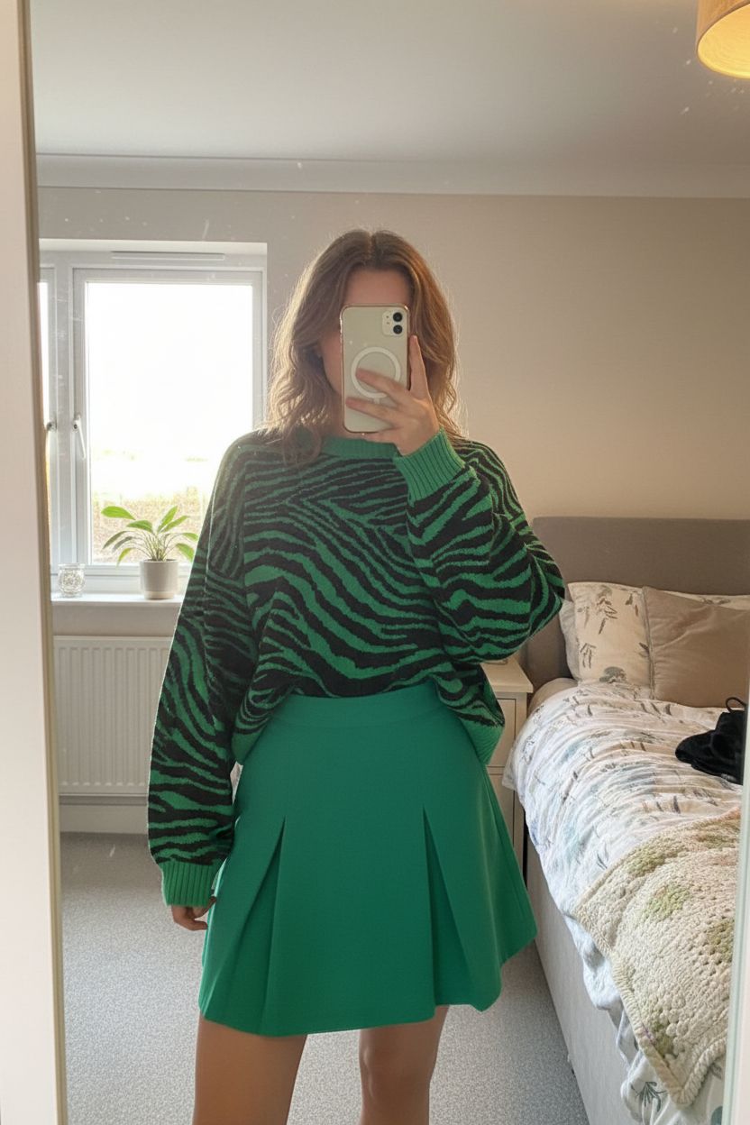 Safari Chic: Apricot Size 10 Top & Skirt Set standing straight facing the camera, in a softly lit bedroom setting, with gentle natural light filtering through a window.