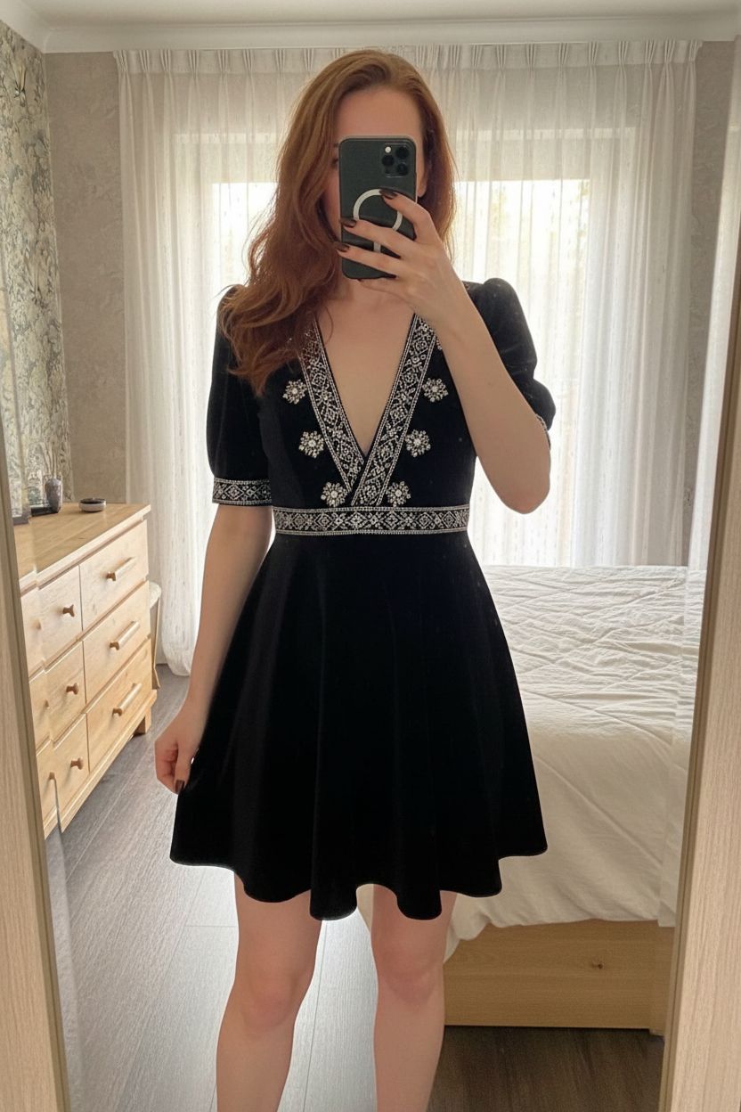 Saloni velvet dress standing straight facing the camera, in a softly lit bedroom setting, with gentle natural light filtering through a window.
