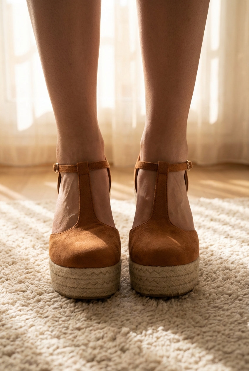Sandales compensées en daim debout, face à la caméra, dans une chambre à la lumière douce, avec une lumière naturelle filtrant par la fenêtre.