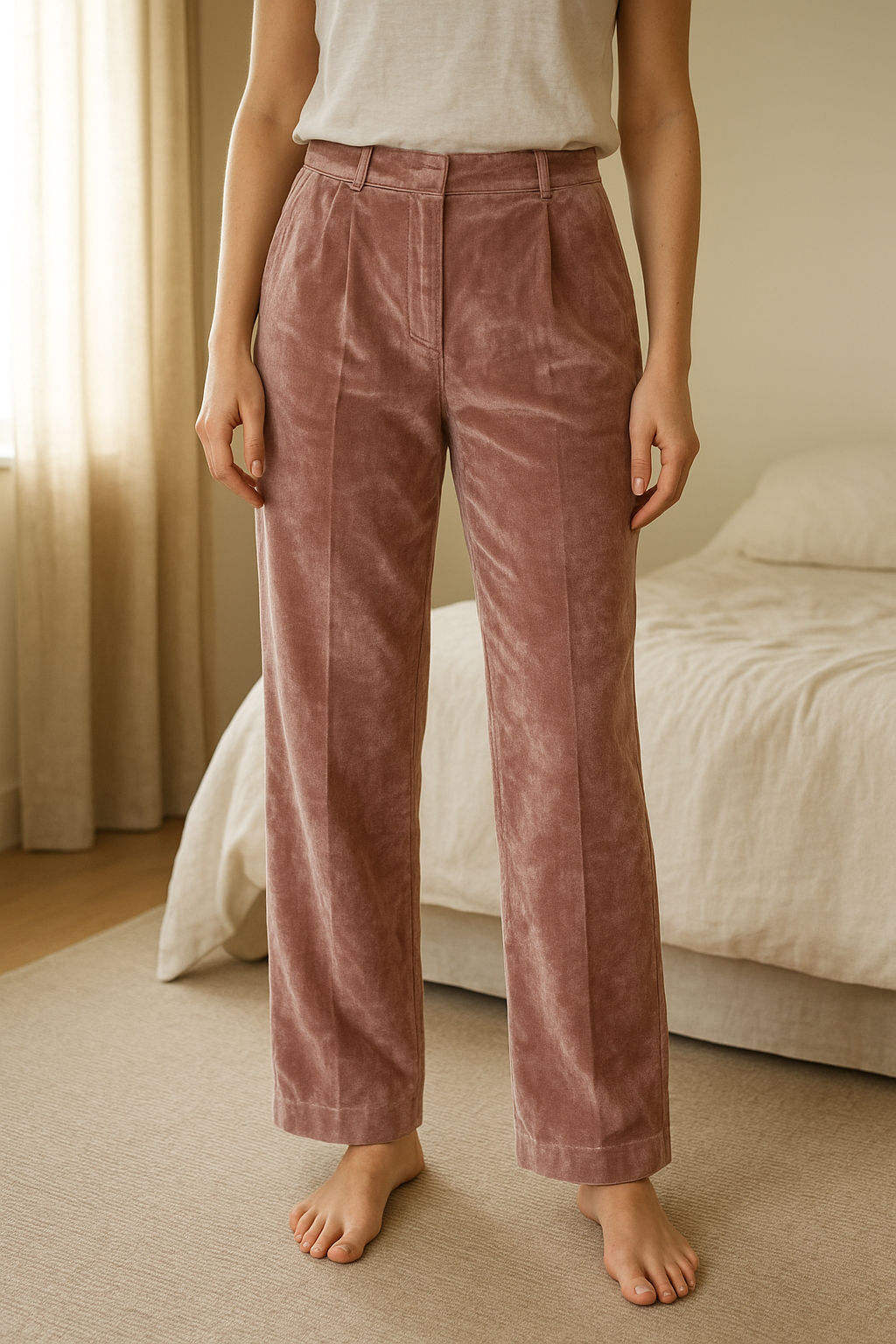 Satin like pink trousers standing straight facing the camera, in a softly lit bedroom setting, with gentle natural light filtering through a window.