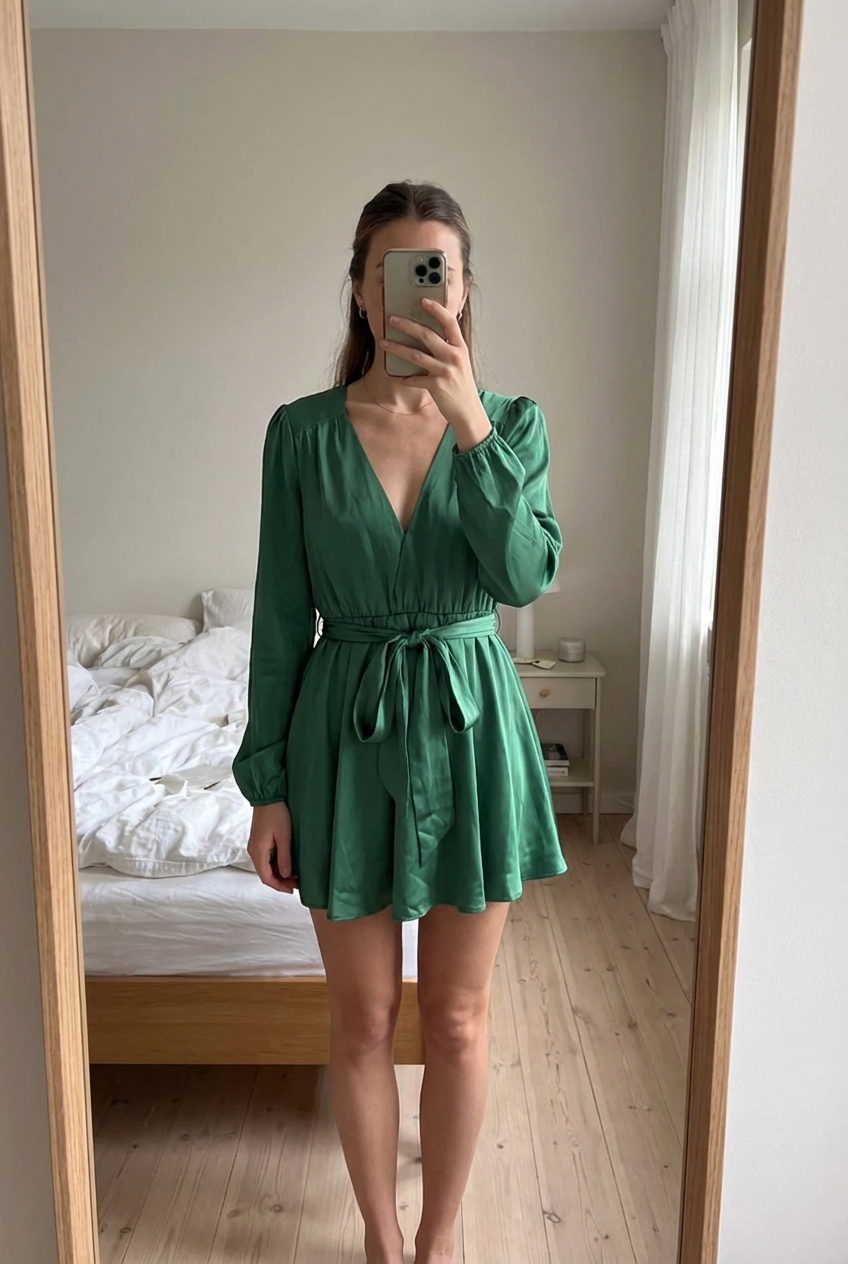 Satin mini dress Lover & Friends standing straight facing the camera, in a softly lit bedroom setting, with gentle natural light filtering through a window.