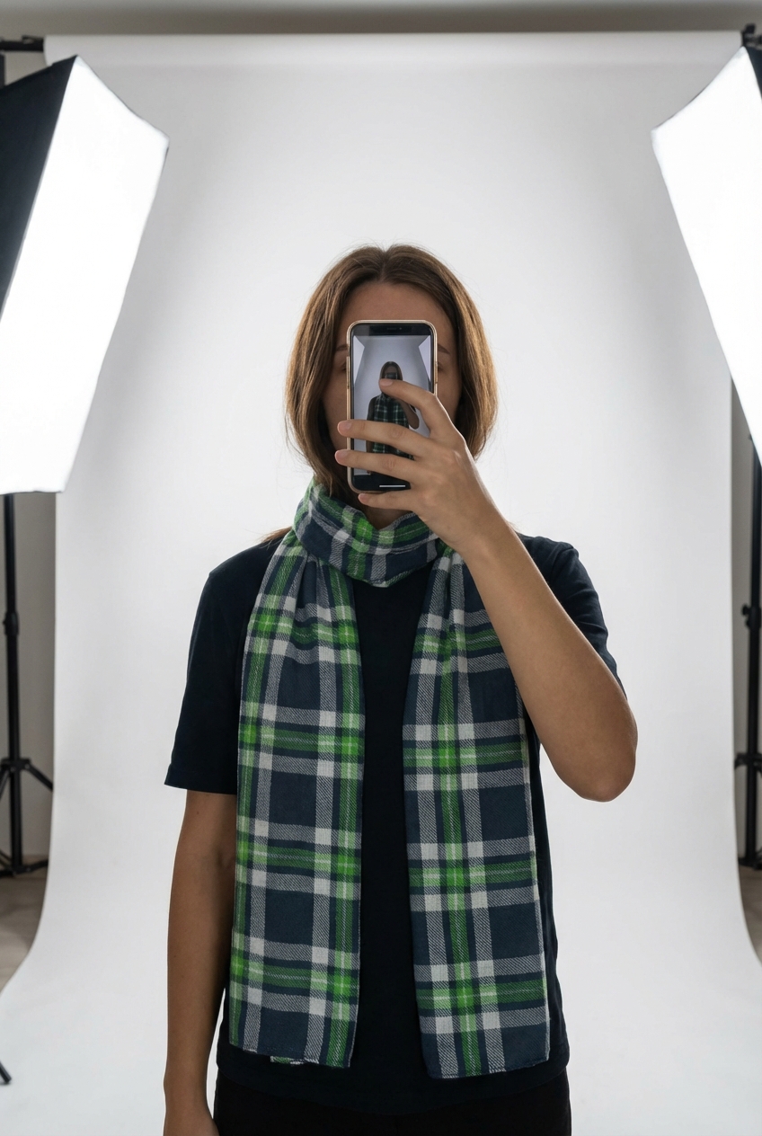 Una persona in Sciarpa vintage a quadri verde e blu – stile casual/classico in piedi, rivolto verso la fotocamera, in uno studio fotografico pulito con sfondo bianco continuo e illuminazione softbox.