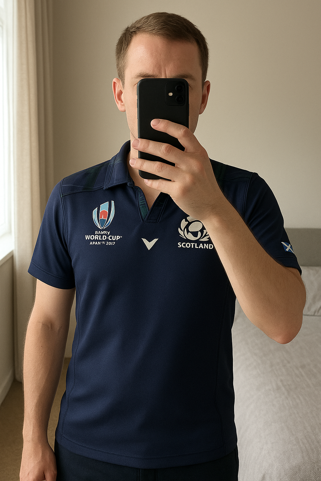 Scotland rugby top age 12 large junior standing straight facing the camera, in a softly lit bedroom setting, with gentle natural light filtering through a window.