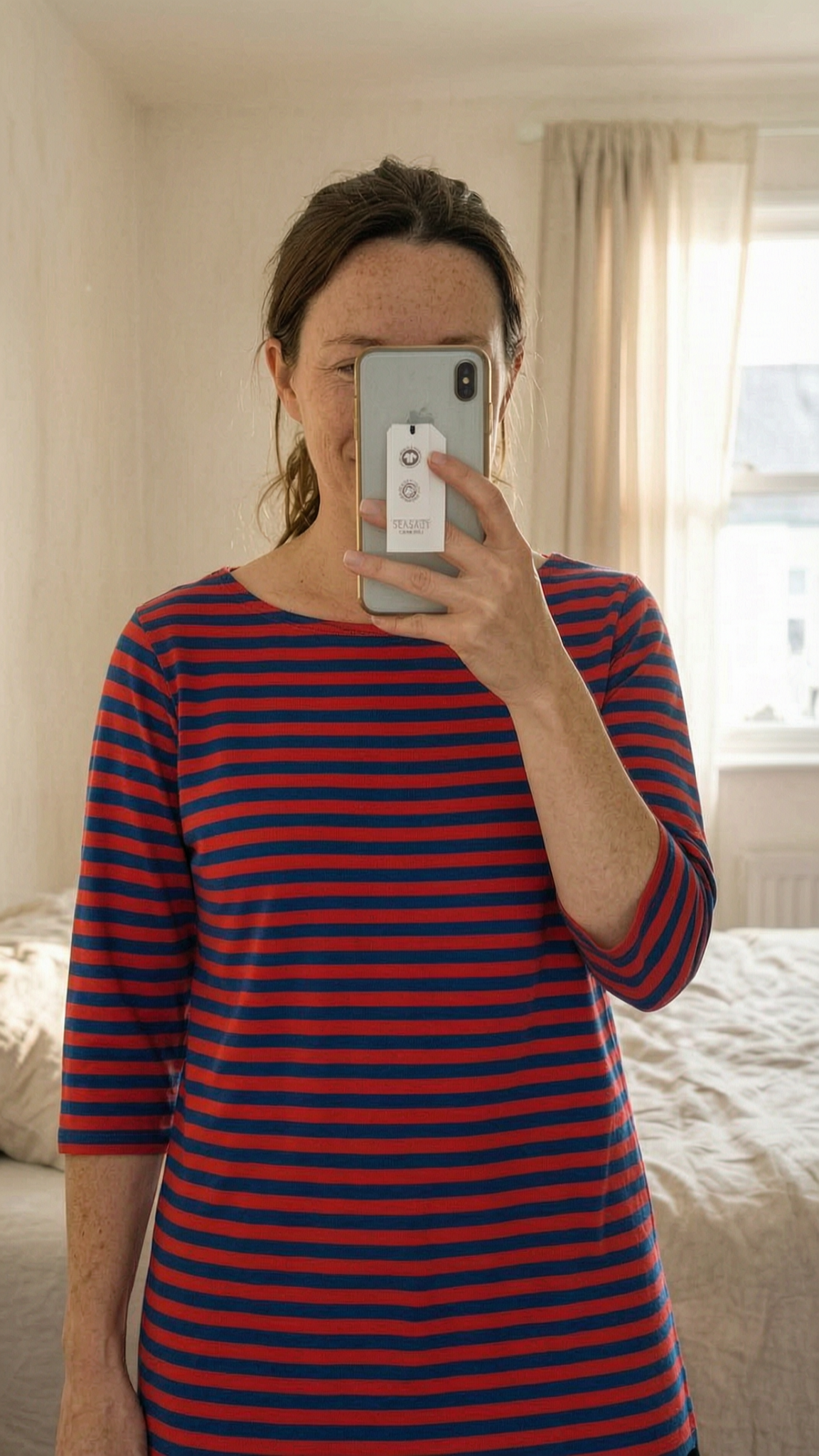 Seasalt Cornwall Sailor Top - Red Blue Striped - UK 8 standing straight facing the camera, in a softly lit bedroom setting, with gentle natural light filtering through a window.
