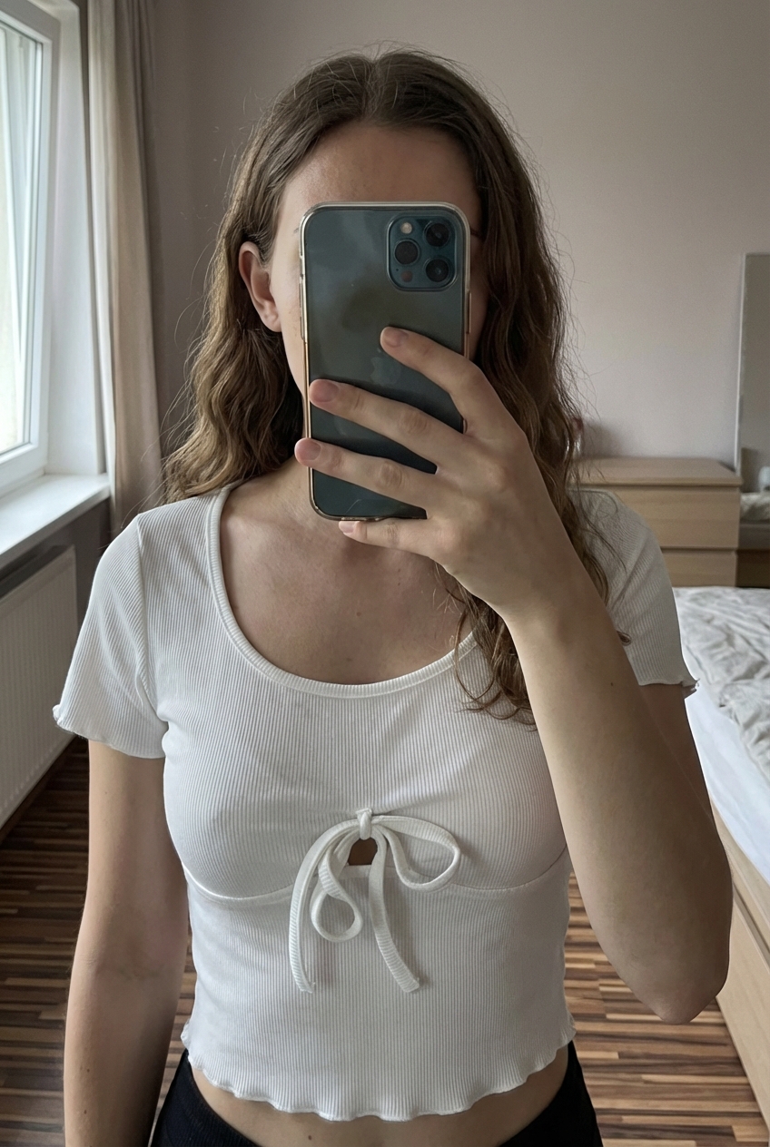 Shein crop póló standing straight facing the camera, in a softly lit bedroom setting, with gentle natural light filtering through a window.